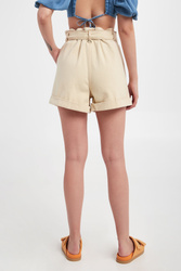 Szorty jeansowe marki Twinset w beżowym kolorze. Fason typu paperbag. W talii marszczenia. Zapinane za pomocą zamka i srebrnej napy. Dodatkowo pasek ze srebrną klamrą. Dwie boczne, wpuszczane kieszenie. Nogawki zakończone podwijaną lamówką. Wykonane z czystej bawełny.