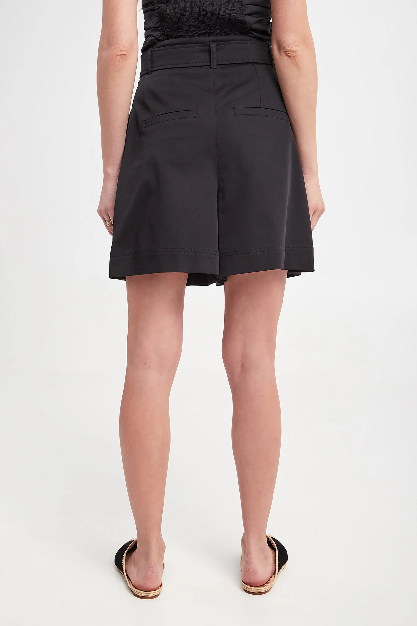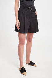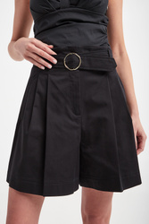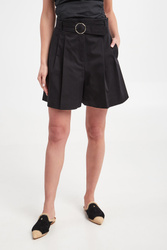 Spodenki marki Marella w czarnym kolorze. Fason typu relaxed fit. Zapinane za pomocą zamka i krytej haftki. W talii dodatkowy pasek ze złotą klamrą. Model z czterema kieszeniami. Nogawki wykończone szeroką lamówką. Na froncie zakładki. Wykonane z bawełnianej tkaniny z domieszką elastycznych włókien.