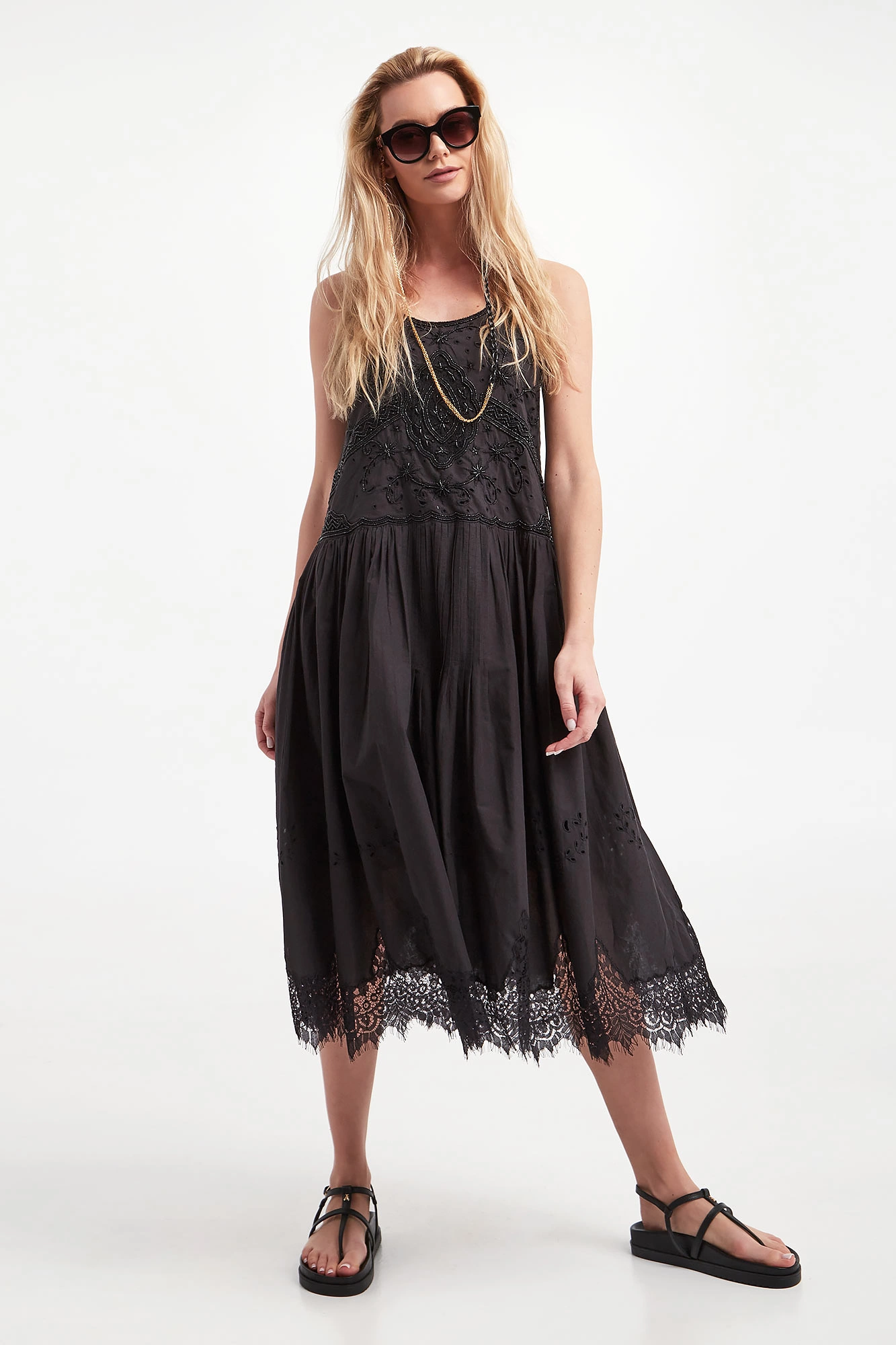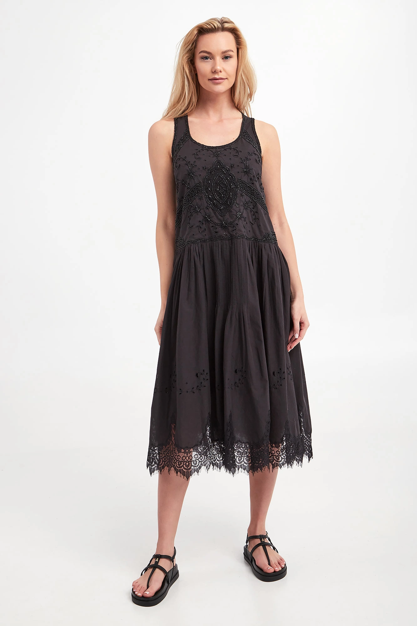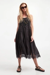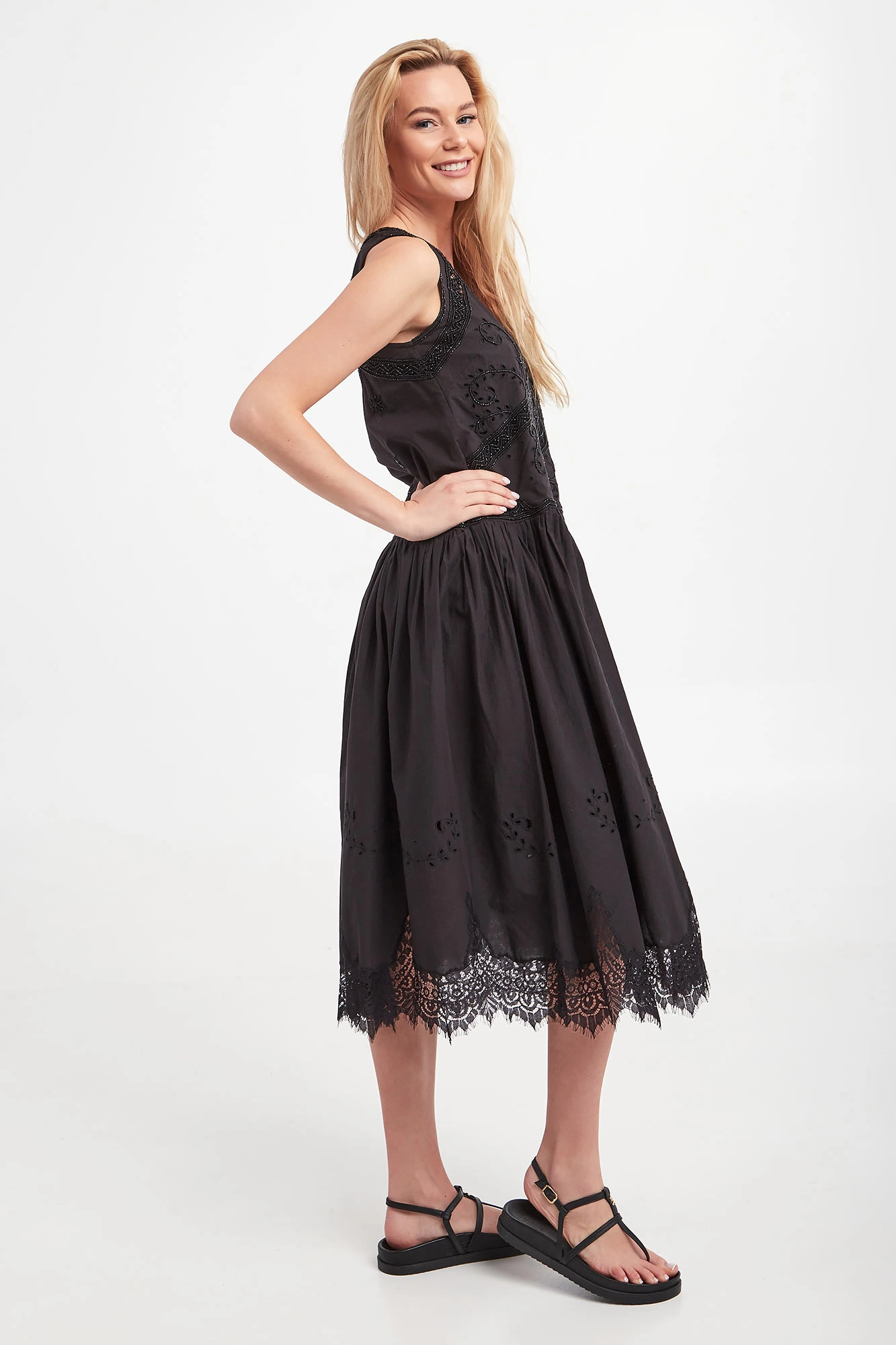 Sukienka marki Twinset w czarnym kolorze. Fason typu regular fit o długości midi. Dekolt typu o-neck zapinany z tyłu za pomocą niewielkiego guzika. Na całości ozdobne kamyczki, hafty i koronki. Dół rozkloszowany, plisowany. Z tyłu metalowa aplikacja w kształcie logo marki z tłoczeniem. Wykonana z czystej bawełny.