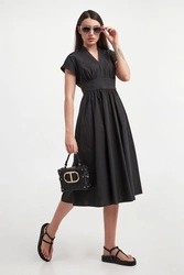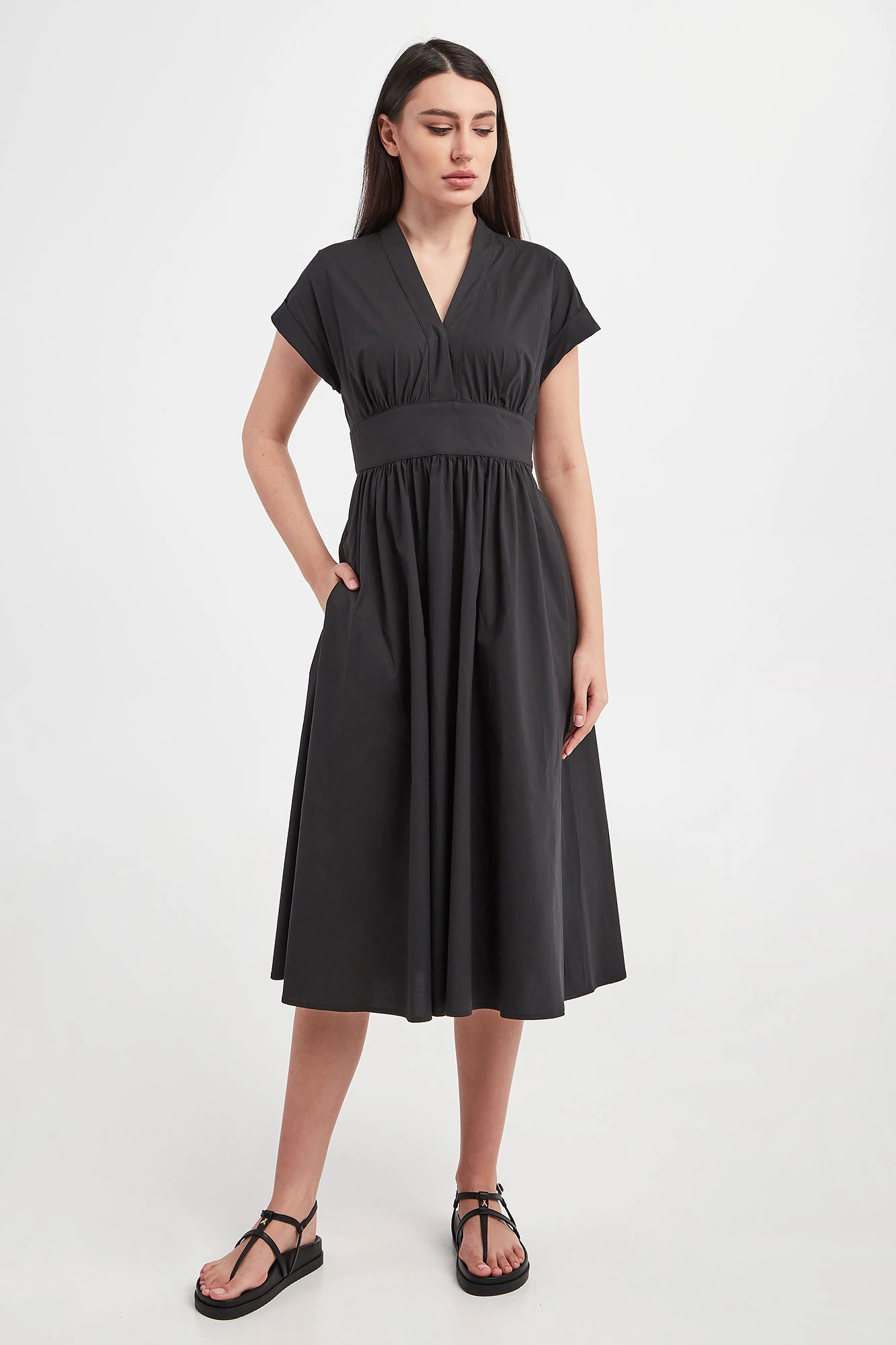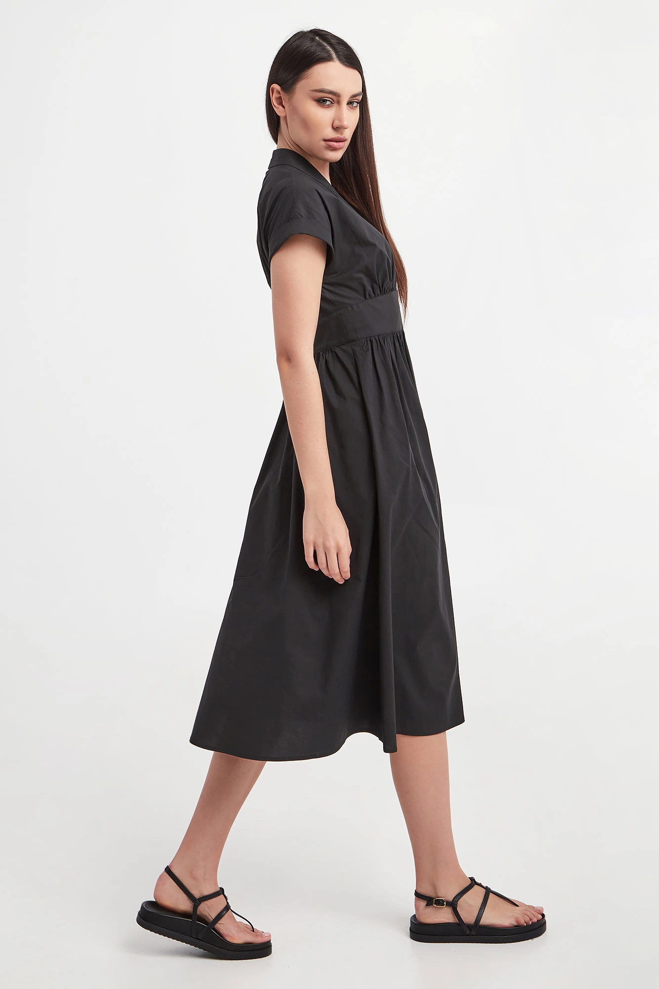 Sukienka marki Marella w czarnym kolorze. Fason typu regular fit o długości midi. Dekolt typu v-neck, zapinany na dole za pomocą napy. Obniżona linia ramion. Rękawy wykończone ozdobnym wywinięciem. W talii marszczona. Po boku zapinana za pomocą zamka błyskawicznego w czarnym kolorze. Dół rozkloszowany. Wykonana z bawełnianej, lekko elastycznej popeliny.