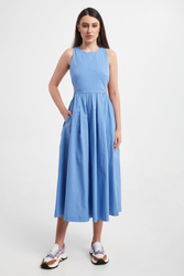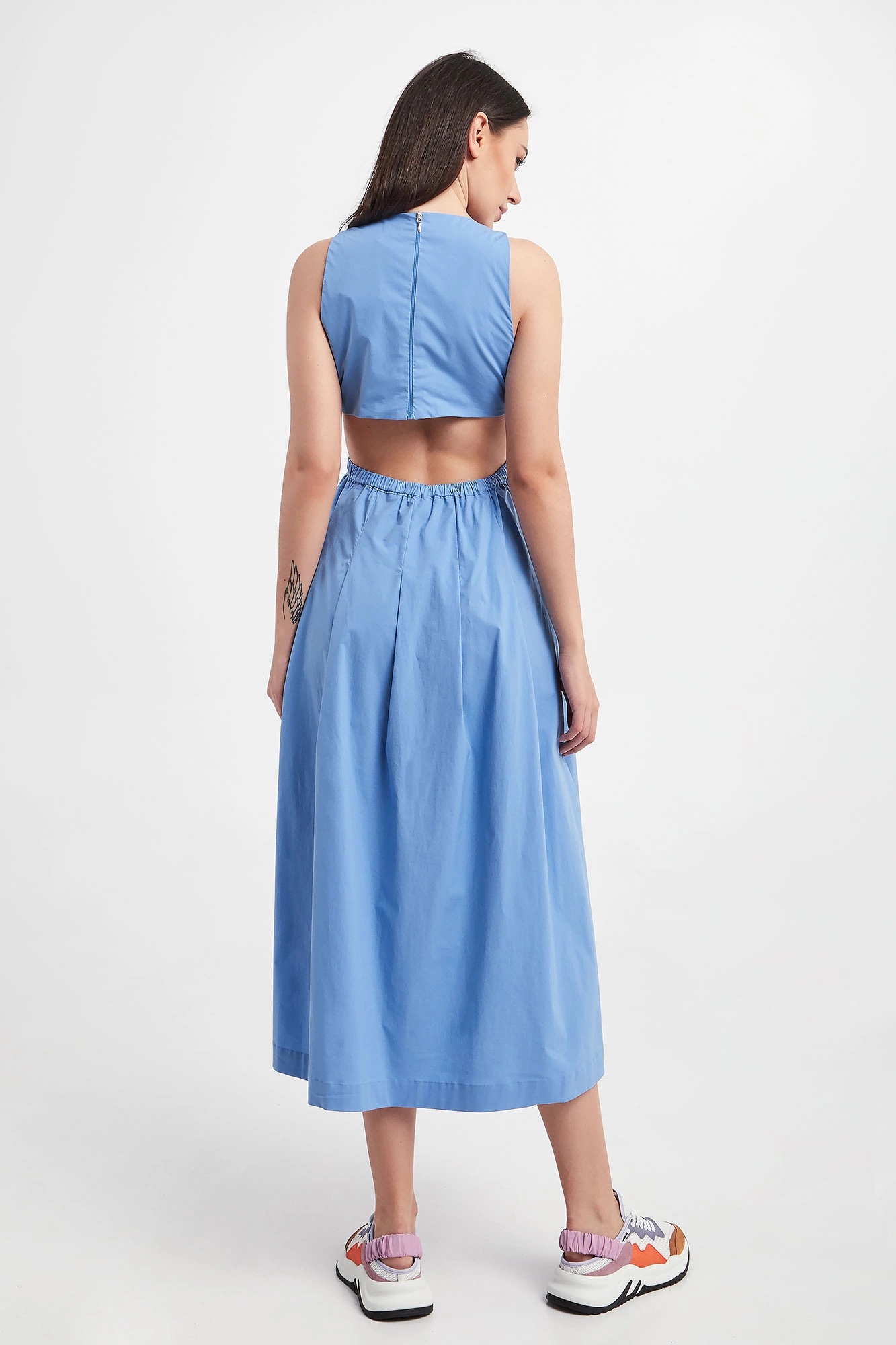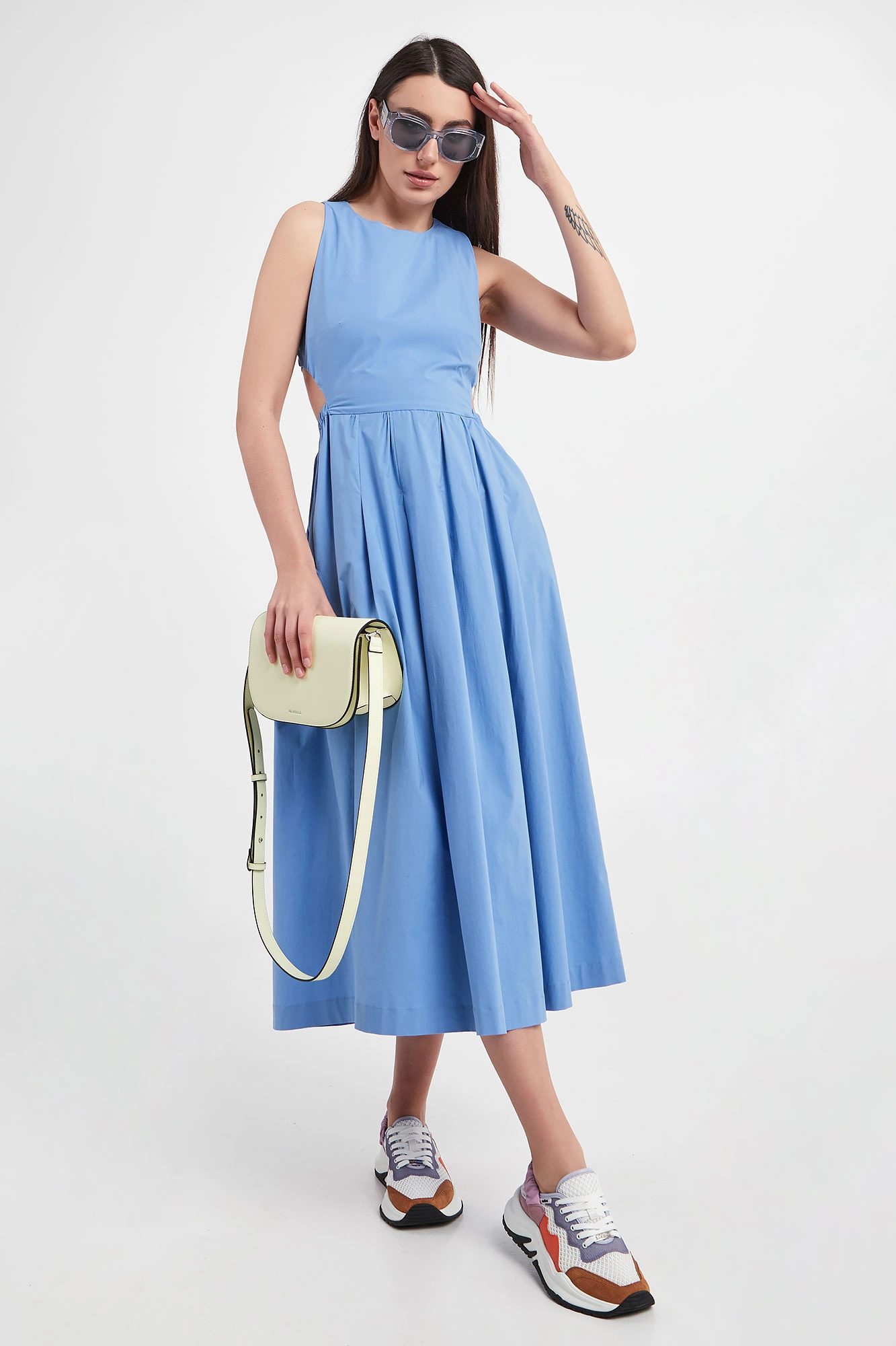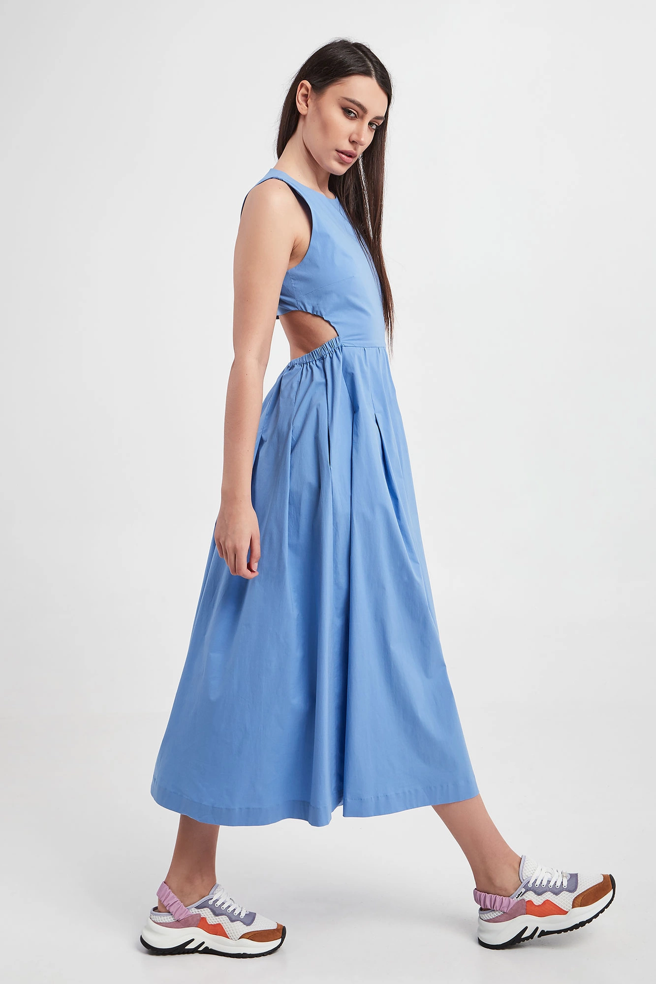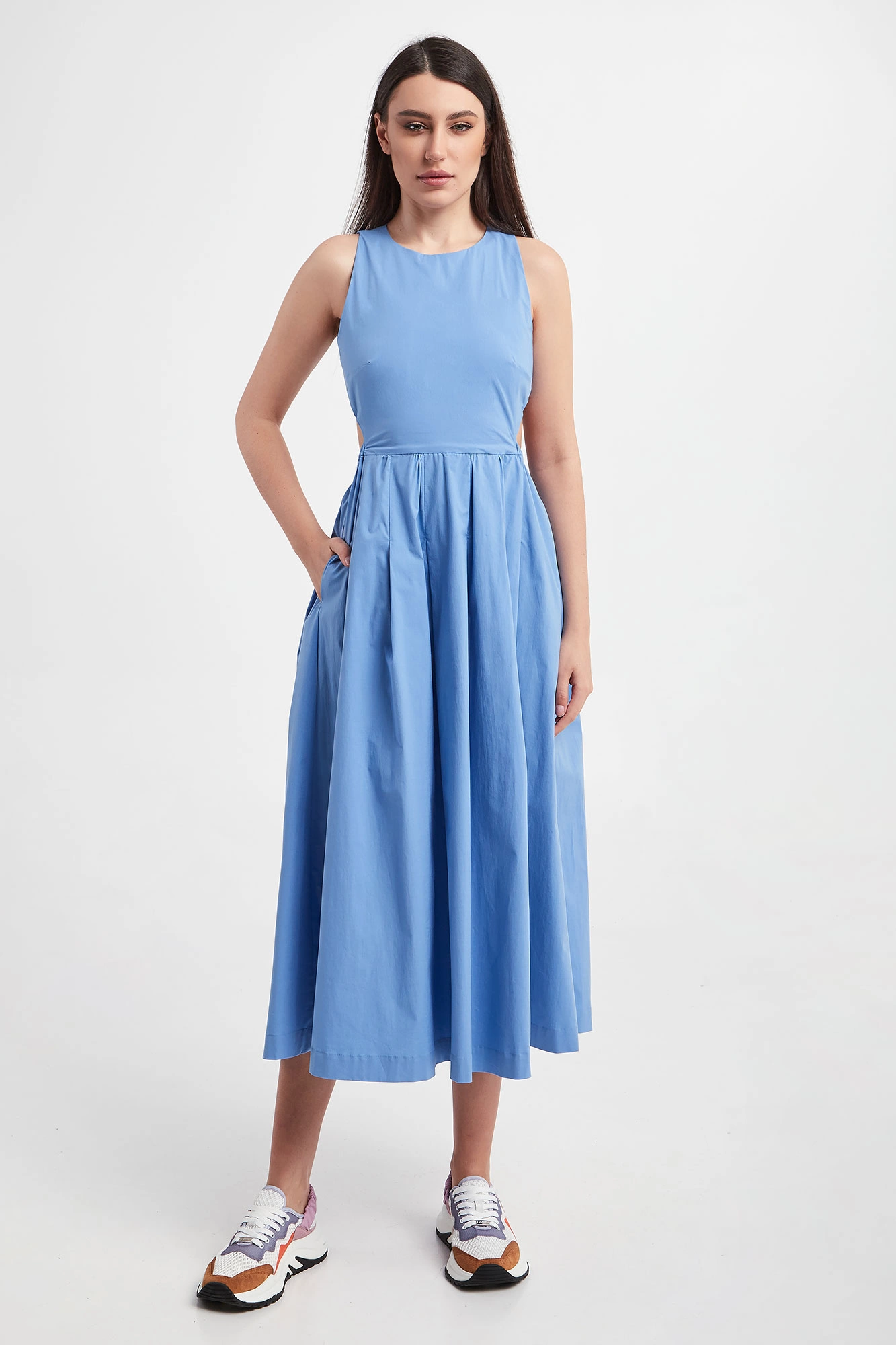 Sukienka marki Marella w błękitnym kolorze. Fason typu regular fit o długości midi. Dół rozkloszowany. Po boku i z tyłu ozdobne wycięcia. Zapinana w górnej części tyłu za pomocą zamka błyskawicznego w kolorze sukienki. W talii elastyczny ściągacz i plisy. Okrągły dekolt typu o-neck. Bez rękawów. Wykonana z elastycznej bawełny.