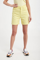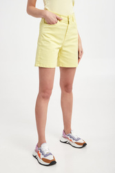 Spodenki marki Marella Monochrome w cytrynowym kolorze. Fason regular fit. Zapinane za pomocą zamka oraz sygnowanego guzika. Model z pięcioma kieszeniami wykończonymi strzępieniami. W pasie szlufki. Nogawki zakończone lamówką. Wykonane z bawełnianej tkaniny z dodatkiem elastanu.