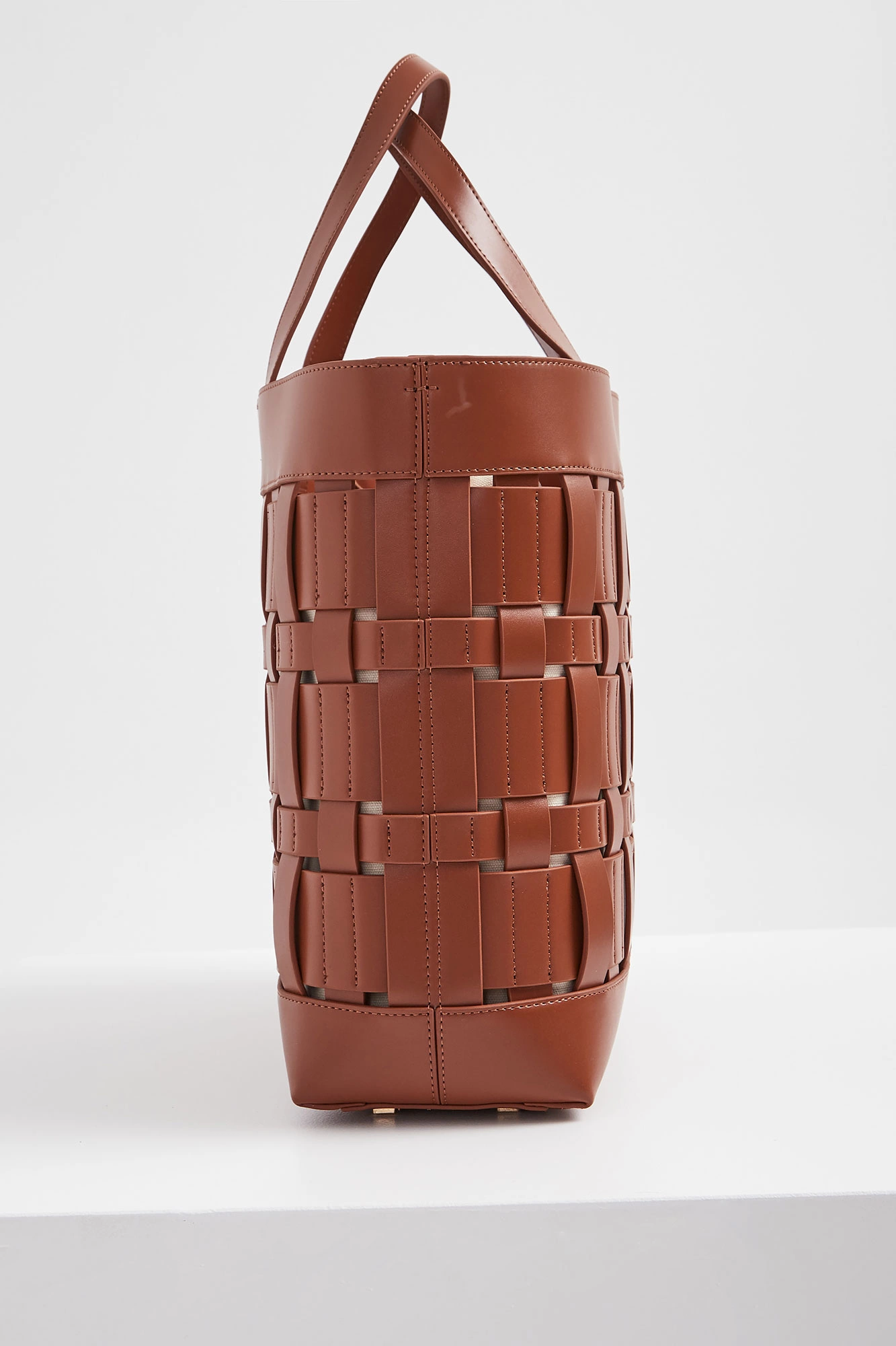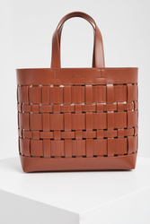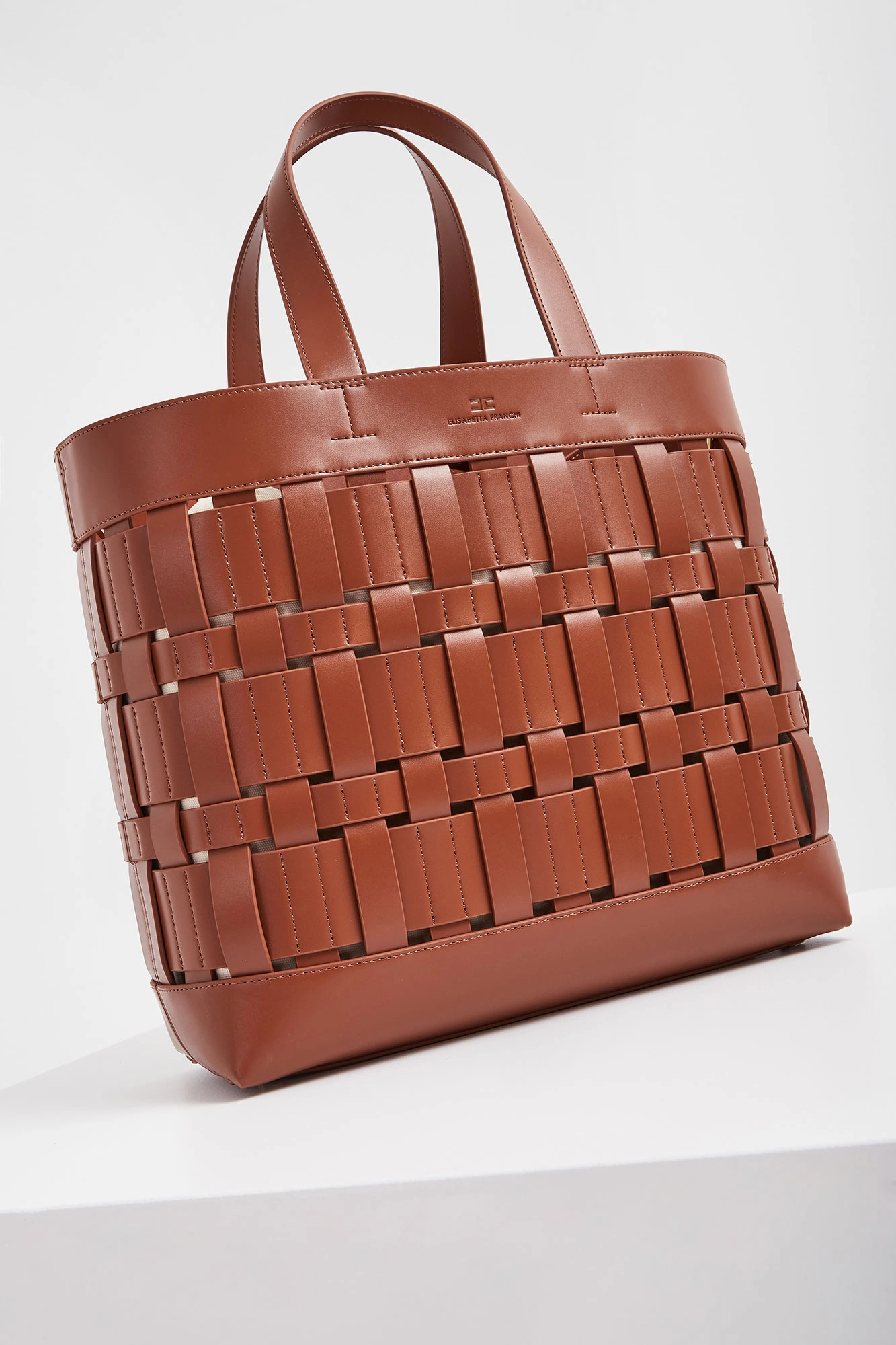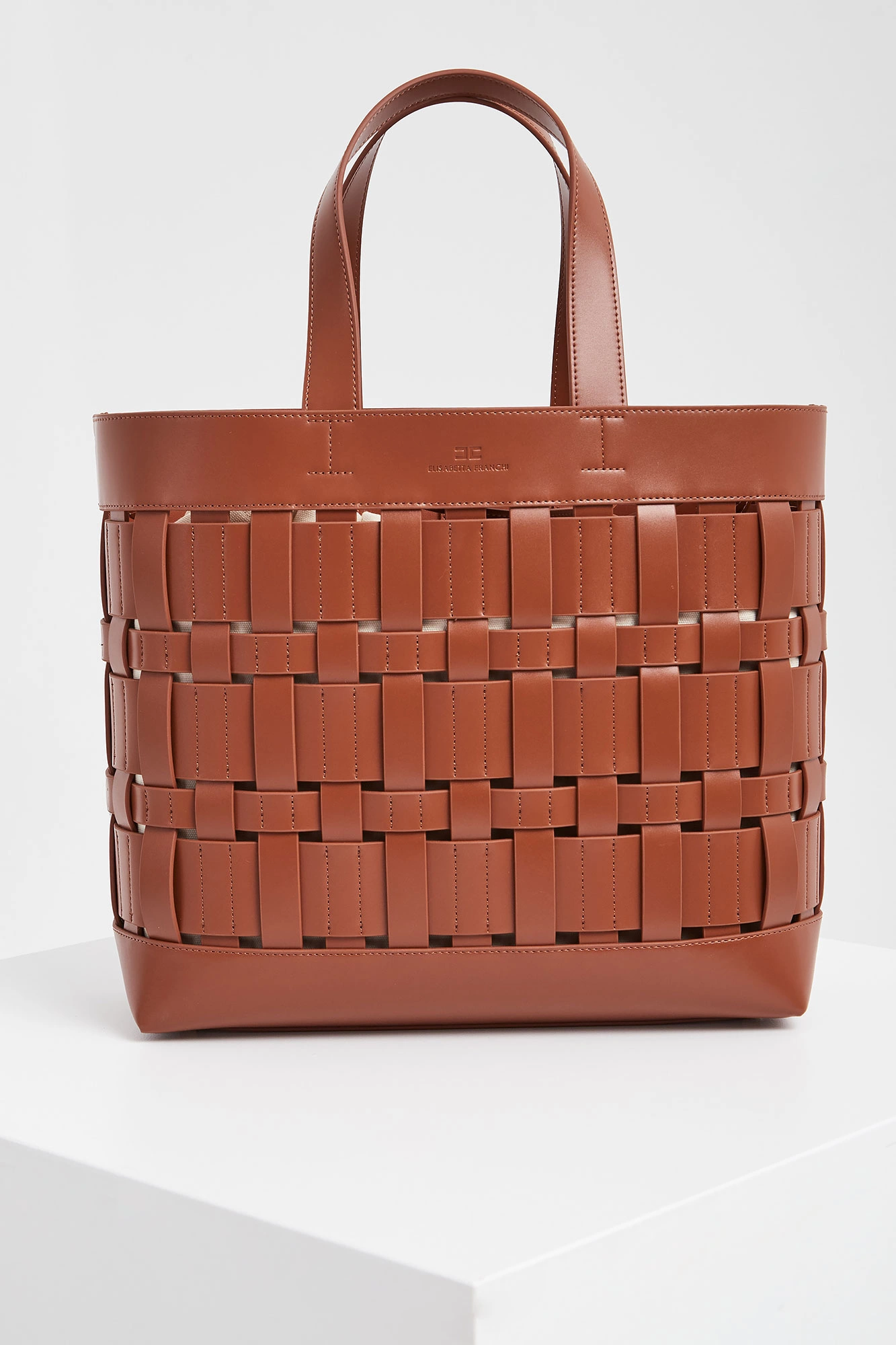 Torebka marki Elisabetta Franchi w brązowym kolorze. Całość pleciona. Z przodu tłoczona nazwa i logo marki. Wewnątrz odpinany, materiałowy worek, regulowany za pomocą skórzanych troczków. Na całości ozdobne przeszycia. Do noszenia na dwóch rączkach. Na spodzie pięć sygnowanych nóżek ułatwiających stawianie. Wykonana z ekoskóry.
