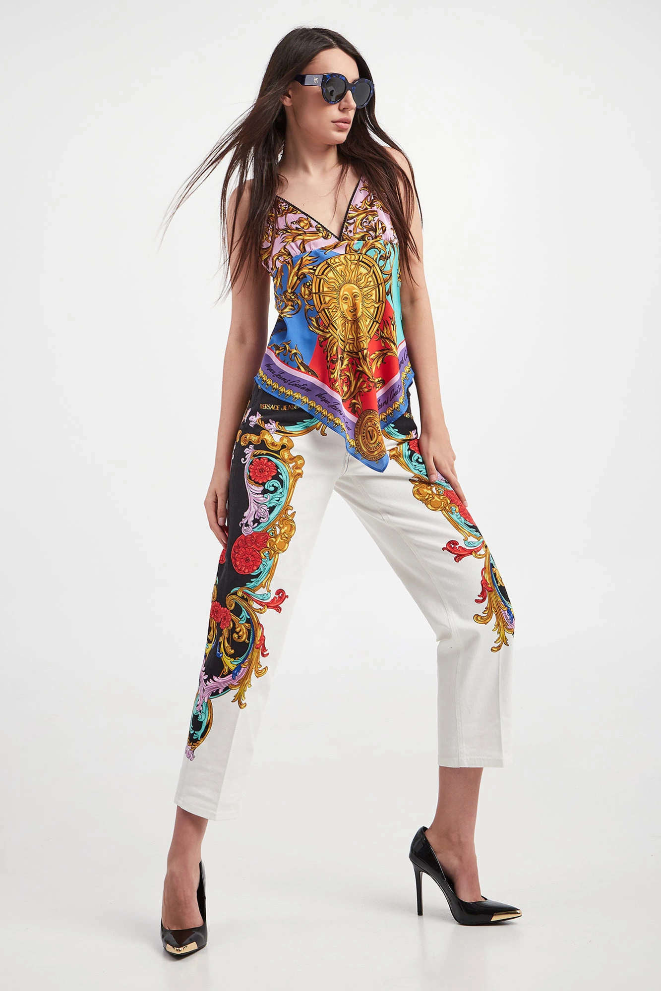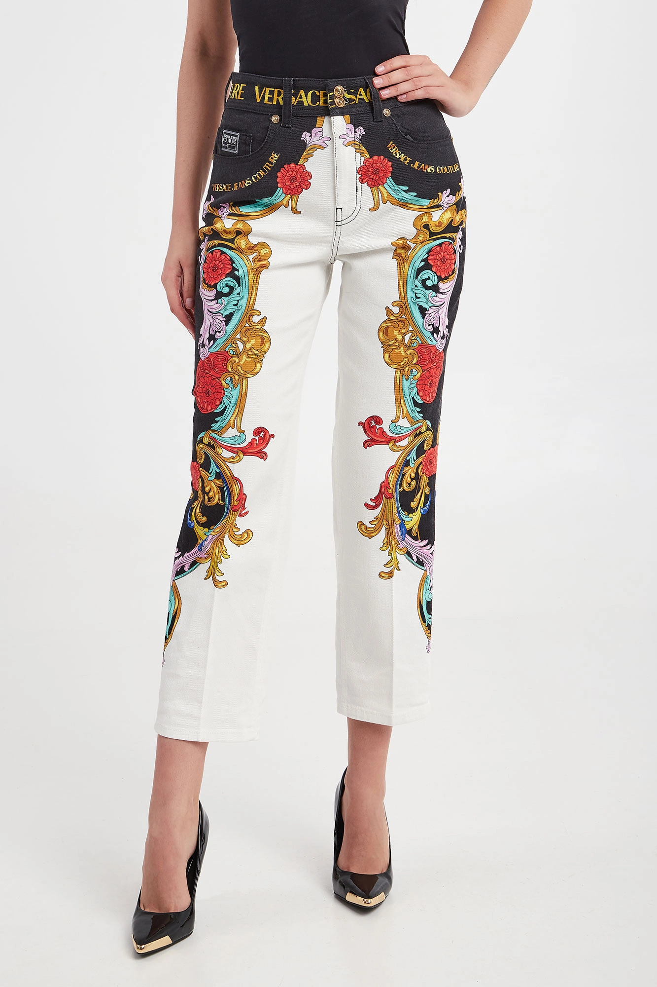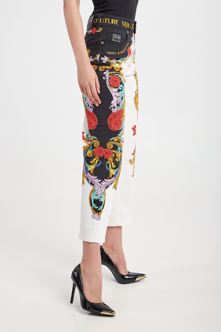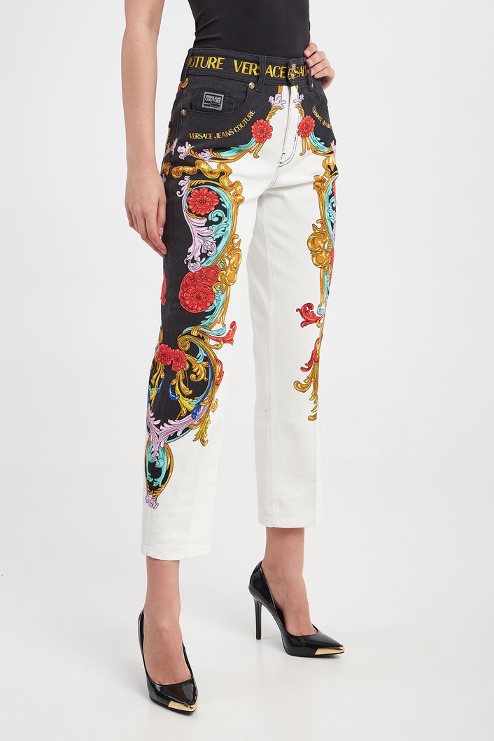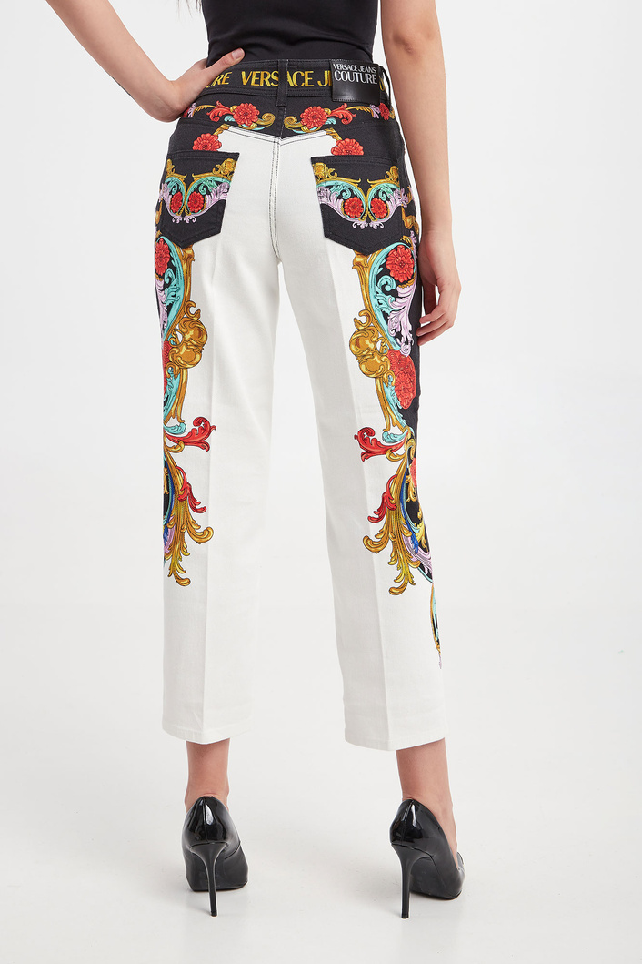 Jeansy marki Versace Jeans Couture w białym kolorze. Fason typu regular fit. Po bokach wielokolorowy wzór. W pasie szlufki oraz napis w postaci nazwy marki w złotym kolorze. Zapinane na zamek oraz dwa dekoracyjne, sygnowane guziki. Model z czterema kieszeniami. Dwie po bokach z przodu i dwie z tyłu. Z tyłu w pasie skórzana naszywka z wytłoczoną nazwą marki w białym kolorze. Nogawki wykończone lamówką.