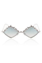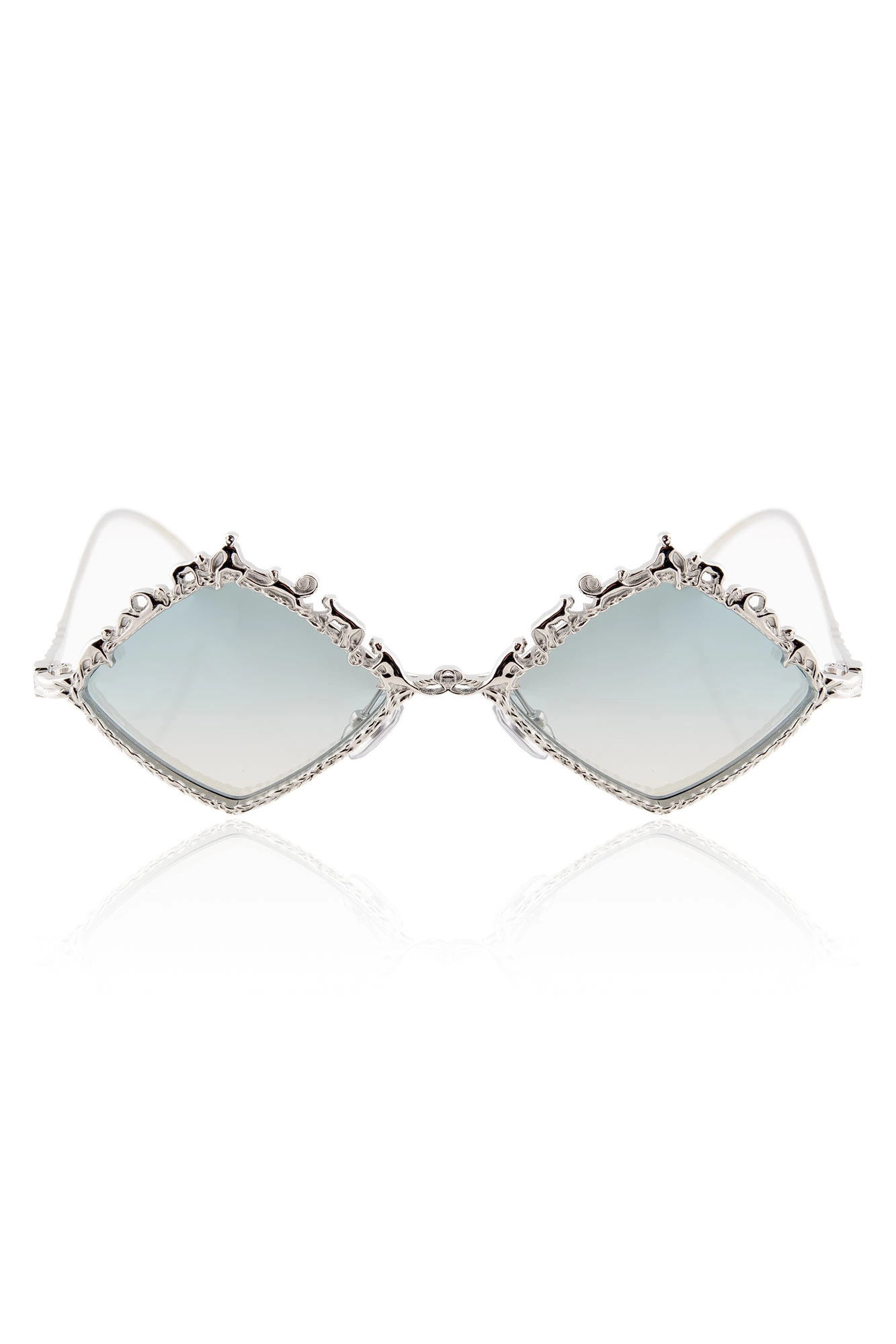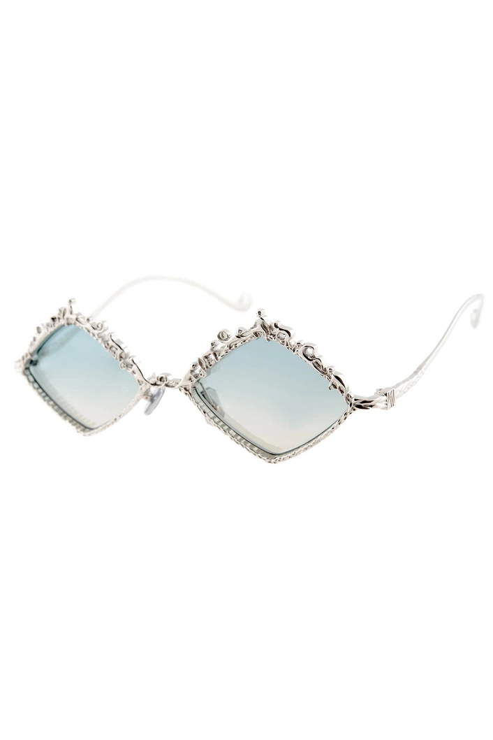 Okulary marki Anna Karin Karlsson w kolorze białego złota. Góra oprawek wykończona w kształt małpek, co daje efekt jakby wspinały się po oprawkach. Mocno wyprofilowane, sygnowane zauszniki. Szkła w kształcie rombu, w kolorze jasnoniebieskim, półprzezroczyste. Model inspirowany sceną muzyczną lat 90.
