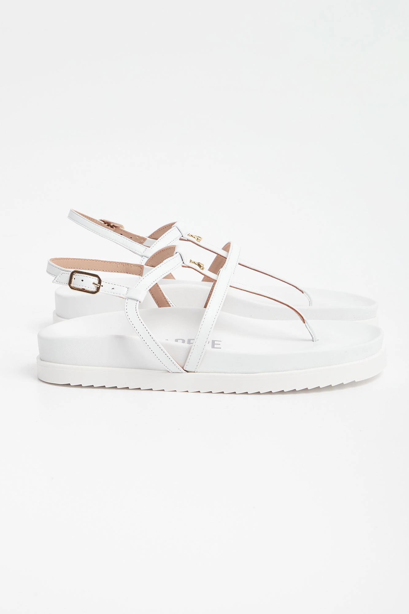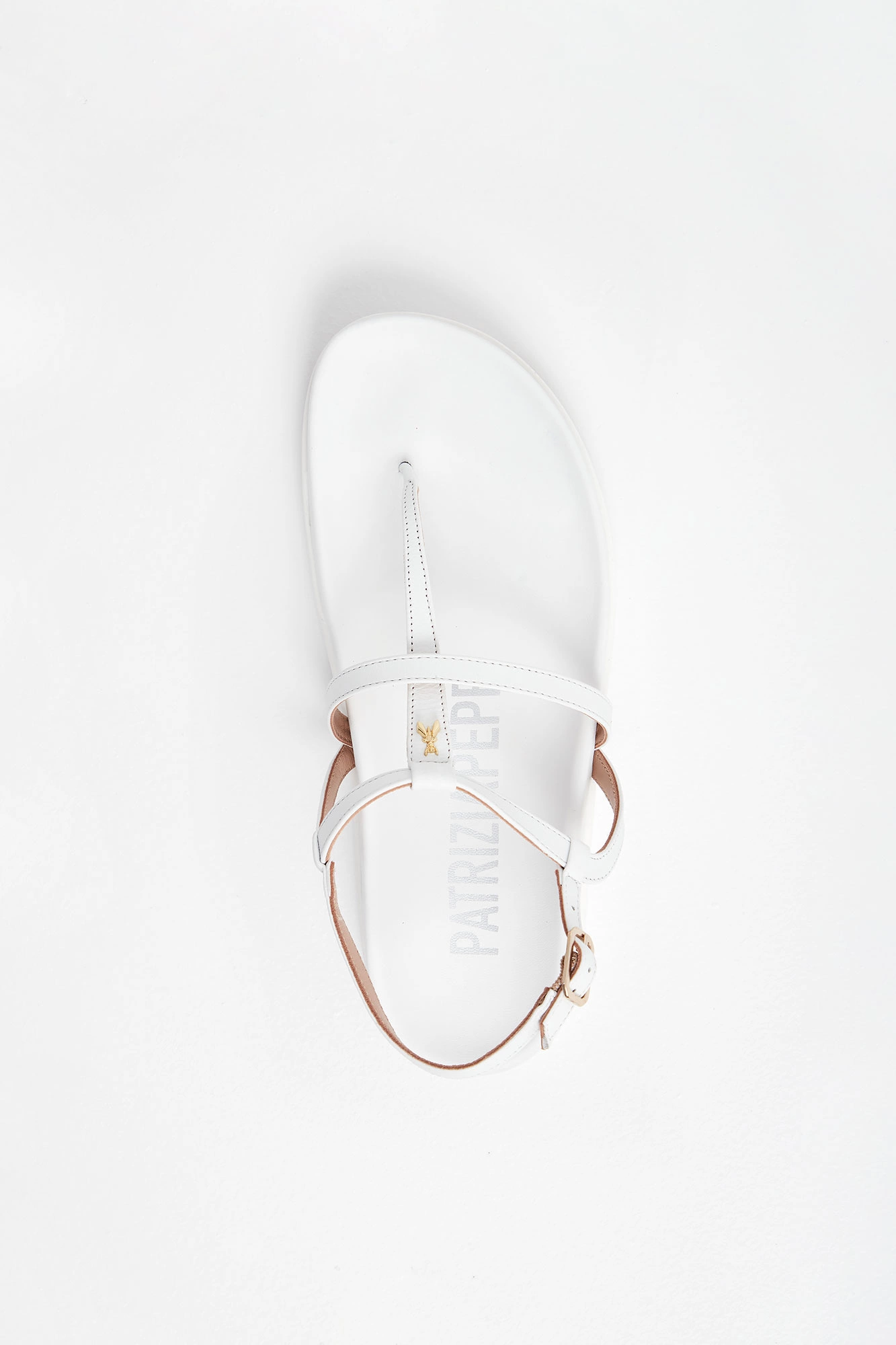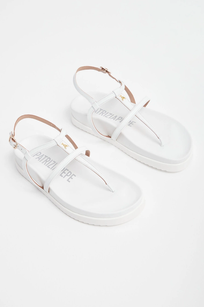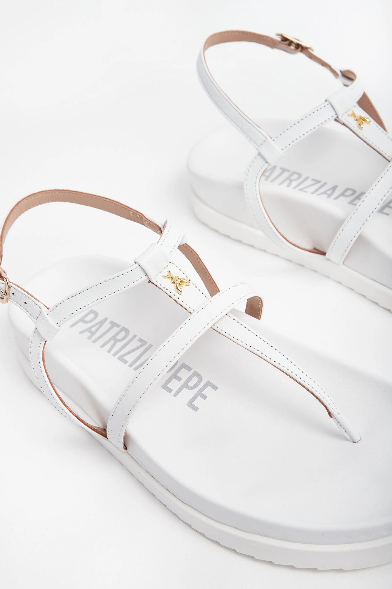Sandały marki Patrizia Pepe w białym kolorze. Wąskie, skórzane paski w typie japonek. Na froncie złota, metalowa aplikacja w kształcie charakterystycznego, owadziego logo. Zapinane za pomocą bocznego, złotego zapięcia. Profilowana, sygnowana podeszwa.