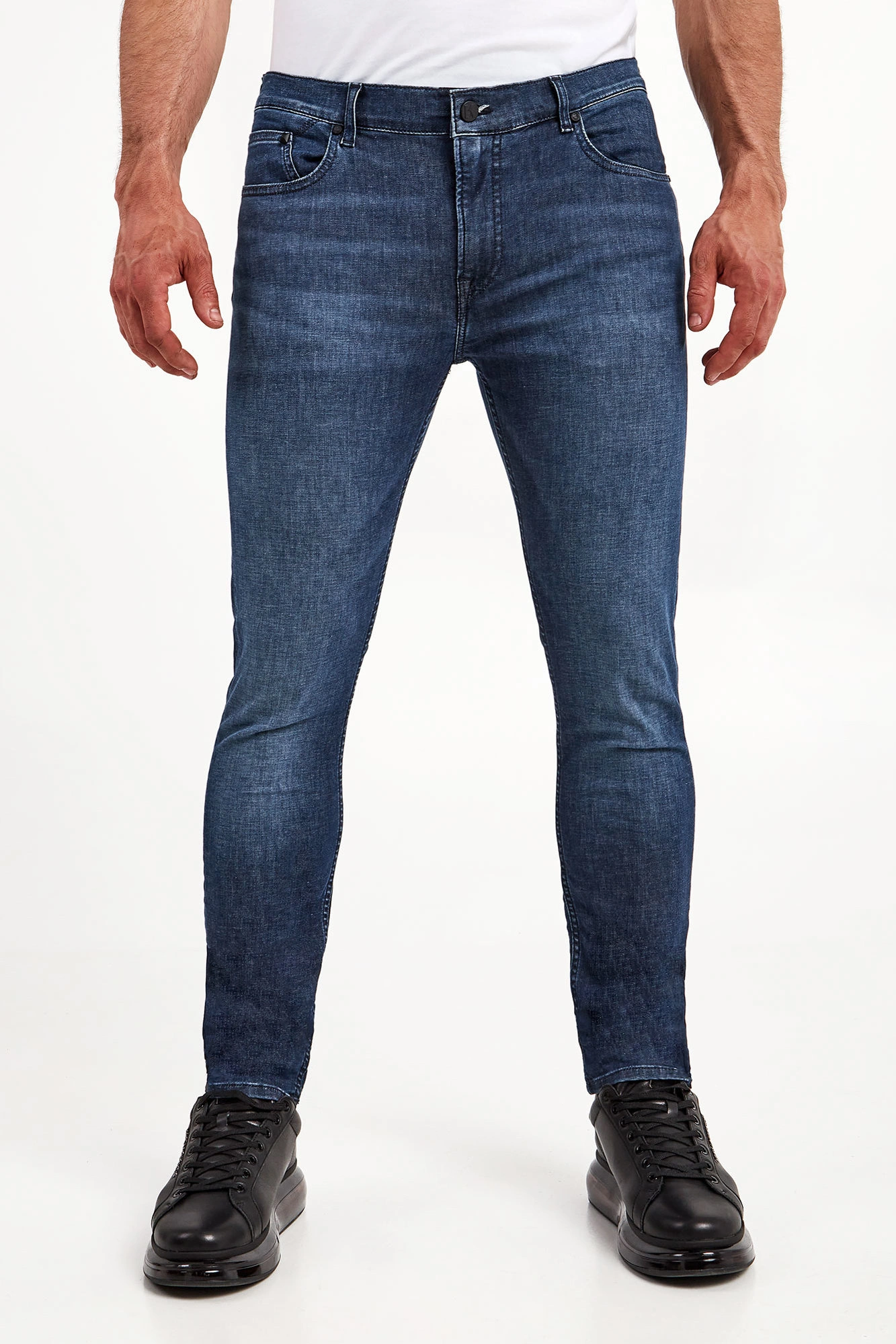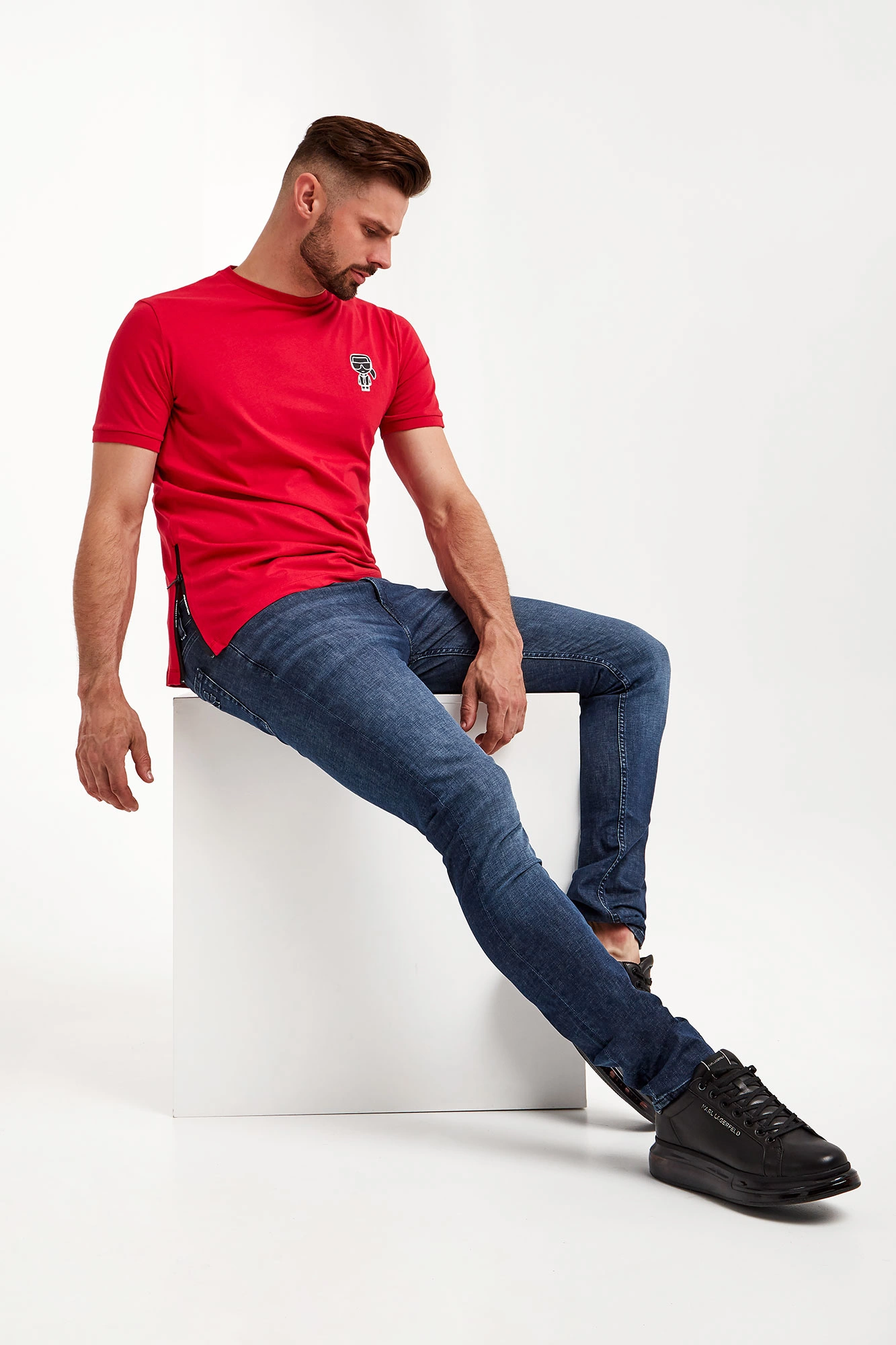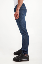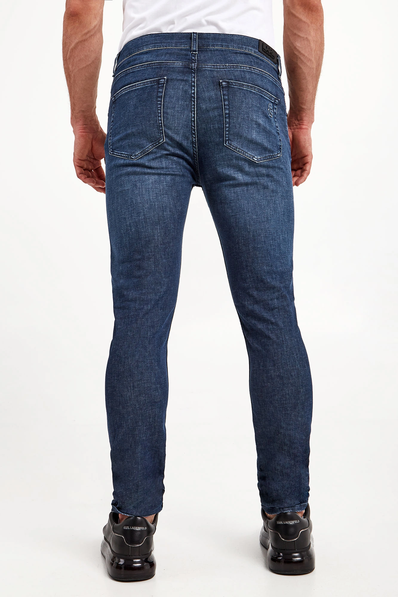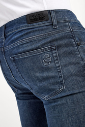 Jeansy marki Karl Lagerfeld w granatowym kolorze. Fason typu slim. W pasie szlufki. Model z pięcioma kieszeniami. Z tyłu w pasie skórzana naszywka z wytłoczoną nazwą marki. Zapinane na zamek oraz sygnowany guzik. Nogawki wykończone lamówką.