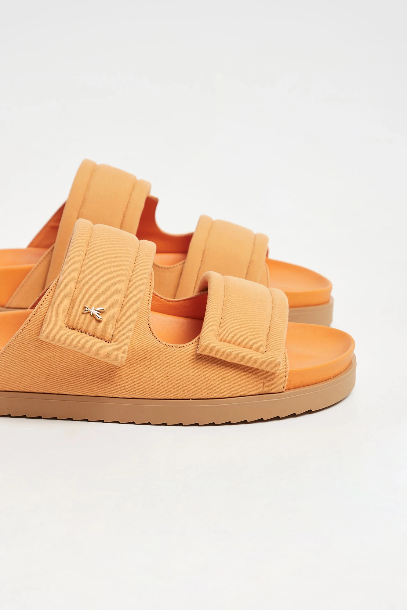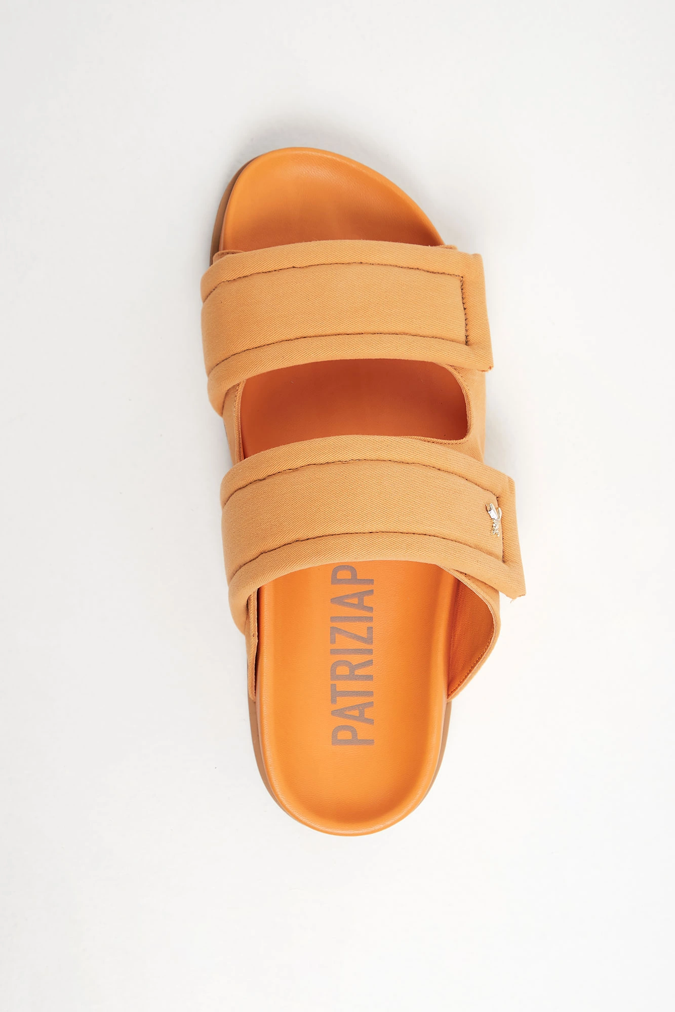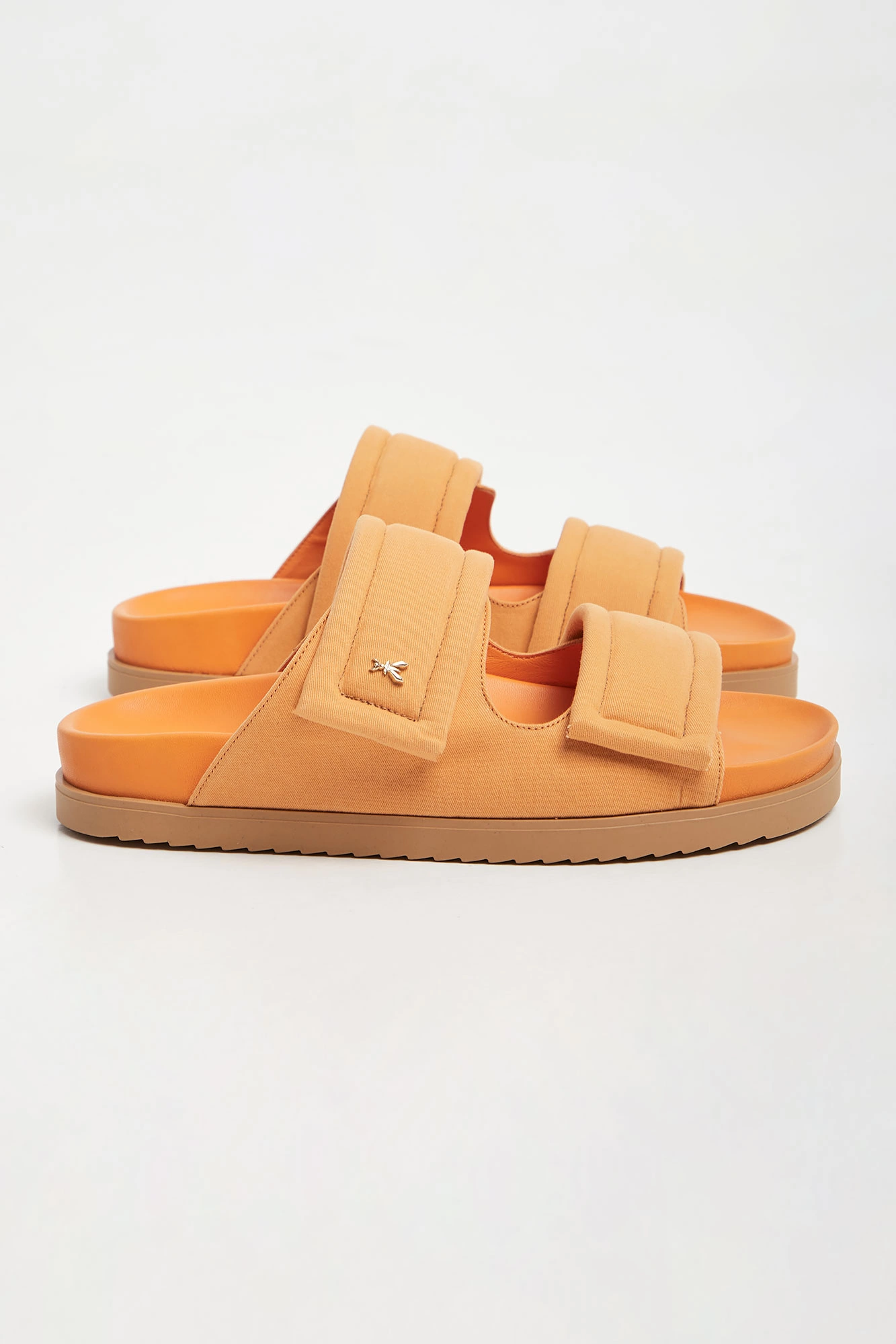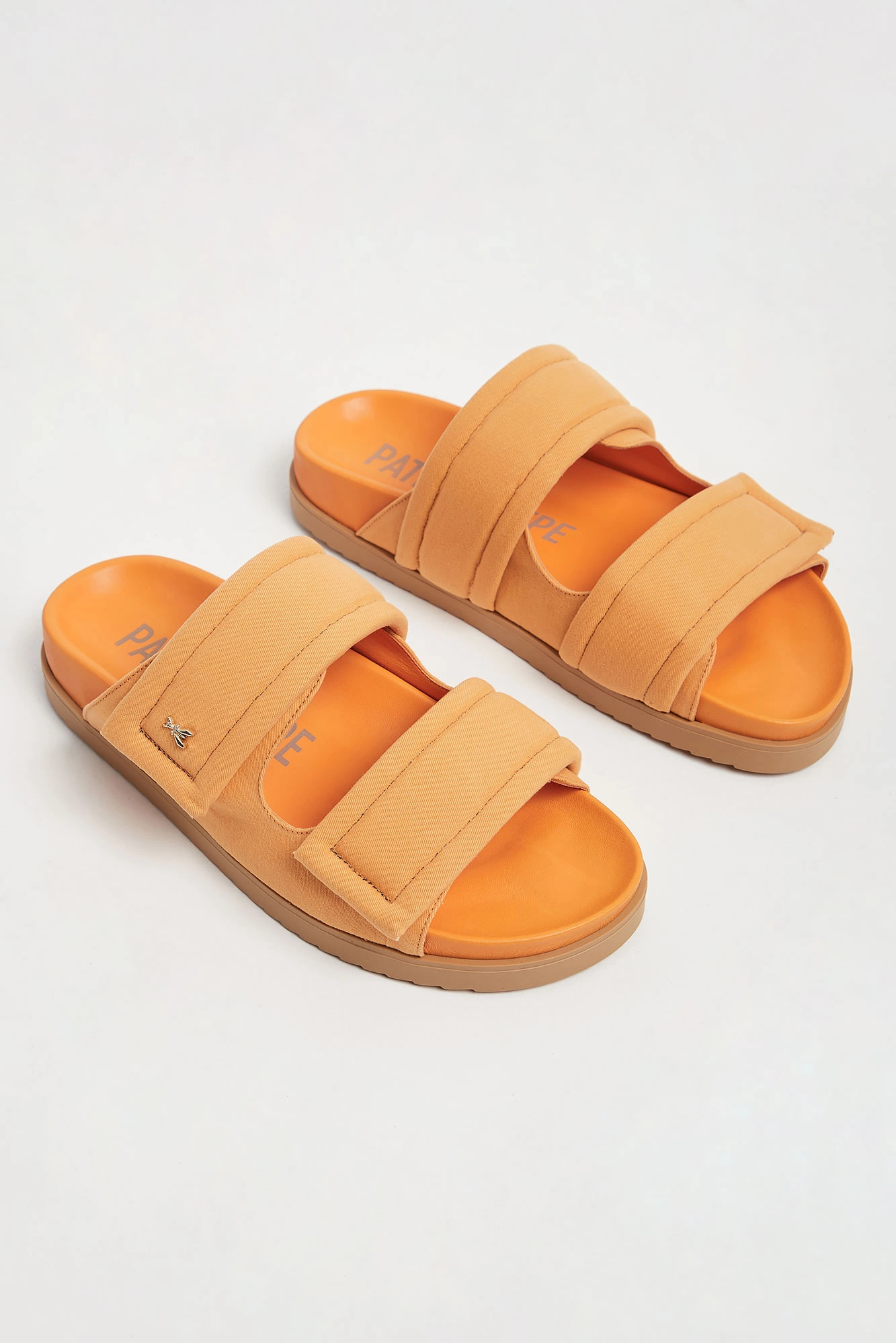 Klapki marki Patrizia Pepe w pomarańczowym kolorze. Z przodu dwa szerokie pasy z aplikacja w kształcie owadziego logo marki w złotym kolorze. Podeszwa sygnowana. Dobrze wyprofilowane i lekkie. Doskonałe do wielu letnich stylizacji.