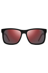 Okulary marki Hugo Boss w czarnym kolorze. Wyprofilowane zauszniki ozdobione czerwonym oraz białym logo. Szkła sygnowane, w ciemnoczerwonym kolorze z efektem lustra. Oryginalne uzupełnienie każdej męskiej stylizacji.