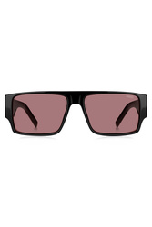 Okulary marki Hugo Boss w czarnym kolorze. Wyprofilowane zauszniki ozdobione kontrastującym, czerwonym logo oraz czerwonymi wstawkami. Sygnowane szkła w bordowym kolorze. Nietuzinkowy model będzie oryginalnym uzupełnieniem każdej stylizacji.