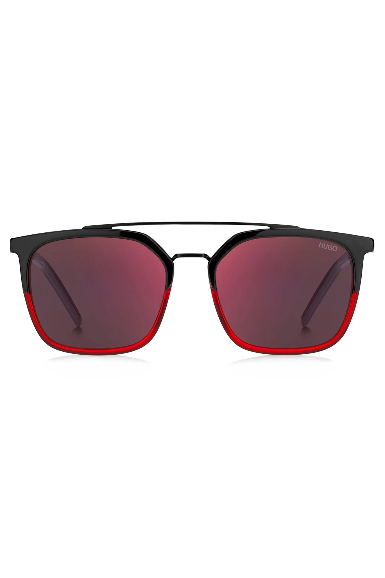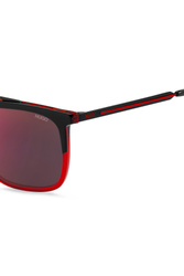 Okulary marki Hugo Boss w czarnym kolorze. Wyprofilowane zauszniki z sygnowanymi wstawkami w czerwonym kolorze. Ruchome, silikonowe noski. Szkła w ciemnoczerwonym kolorze z kontrastującym, białym nadrukiem z nazwą marki. Oprawka w czarno-czerwonym kolorze.