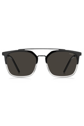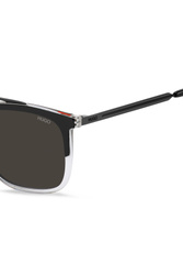 Okulary marki Hugo Boss w czarnym kolorze. Wyprofilowane zauszniki z sygnowanymi wstawkami. Ruchome, silikonowe noski. Szkła w ciemnoszarym kolorze z kontrastującym, czerwonym nadrukiem z nazwą marki. Oprawka w czarno-przeźroczystym kolorze. Na lewym szkle napis w białym kolorze w postaci nazwy marki.