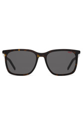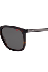 Okulary marki Hugo Boss w czarnym kolorze z beżowymi, półprzeźroczystymi wstawkami. Wyprofilowane zauszniki ozdobione szarym paskiem z białym logo marki. Na prawym szkle czerwona nazwa marki. Szkła w ciemnoszarym kolorze.