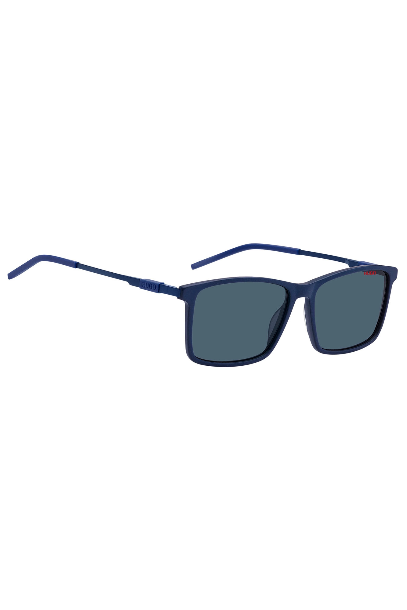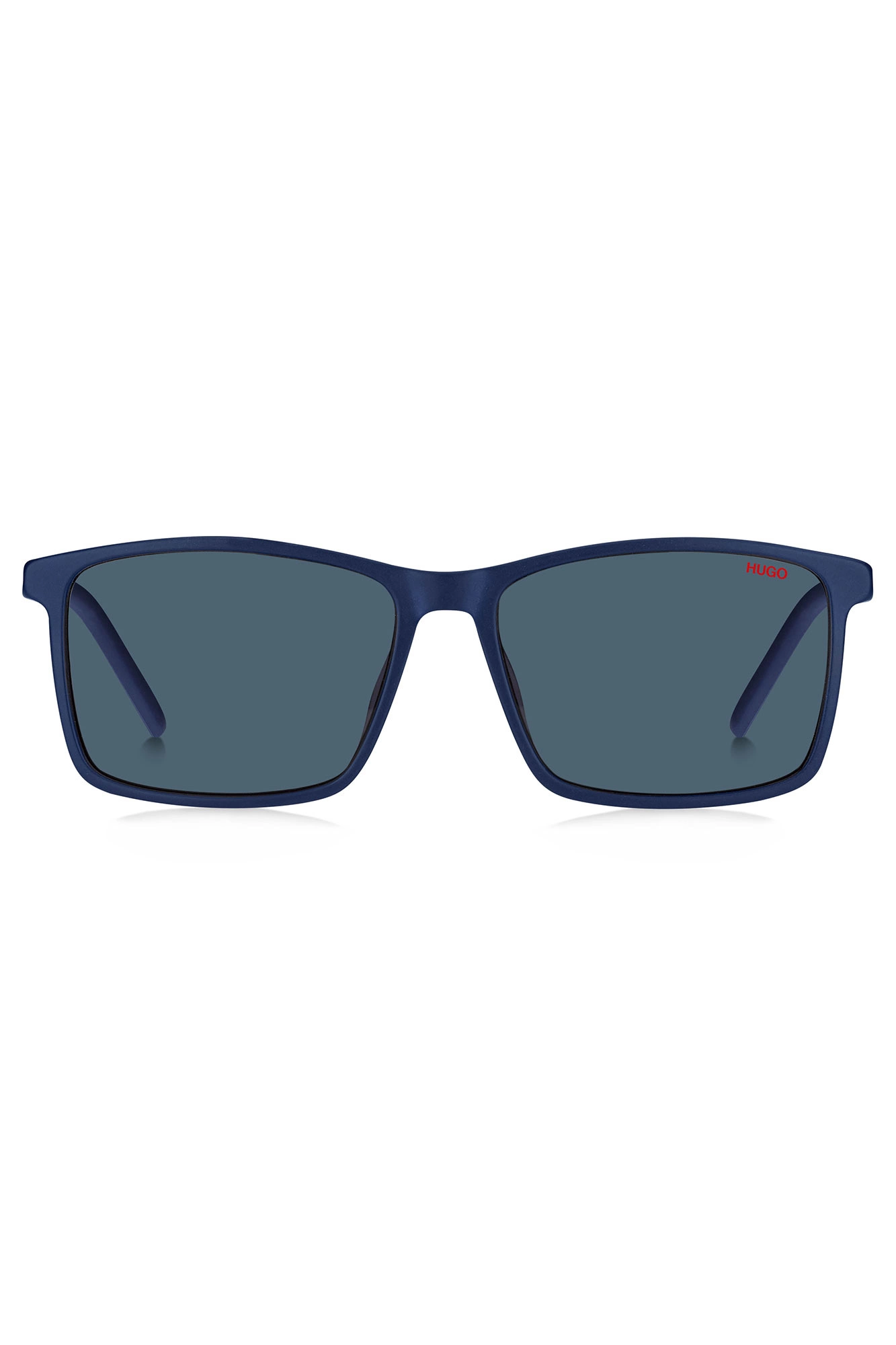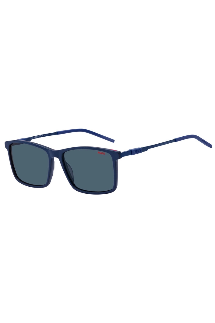 Okulary marki Hugo Boss w matowym granatowym kolorze. Zauszniki wyprofilowane, sygnowane tłoczonym napisem w postaci nazwy marki. Szkła w ciemnoszarym kolorze. Na lewym szkle czerwony napis w postaci logo marki.