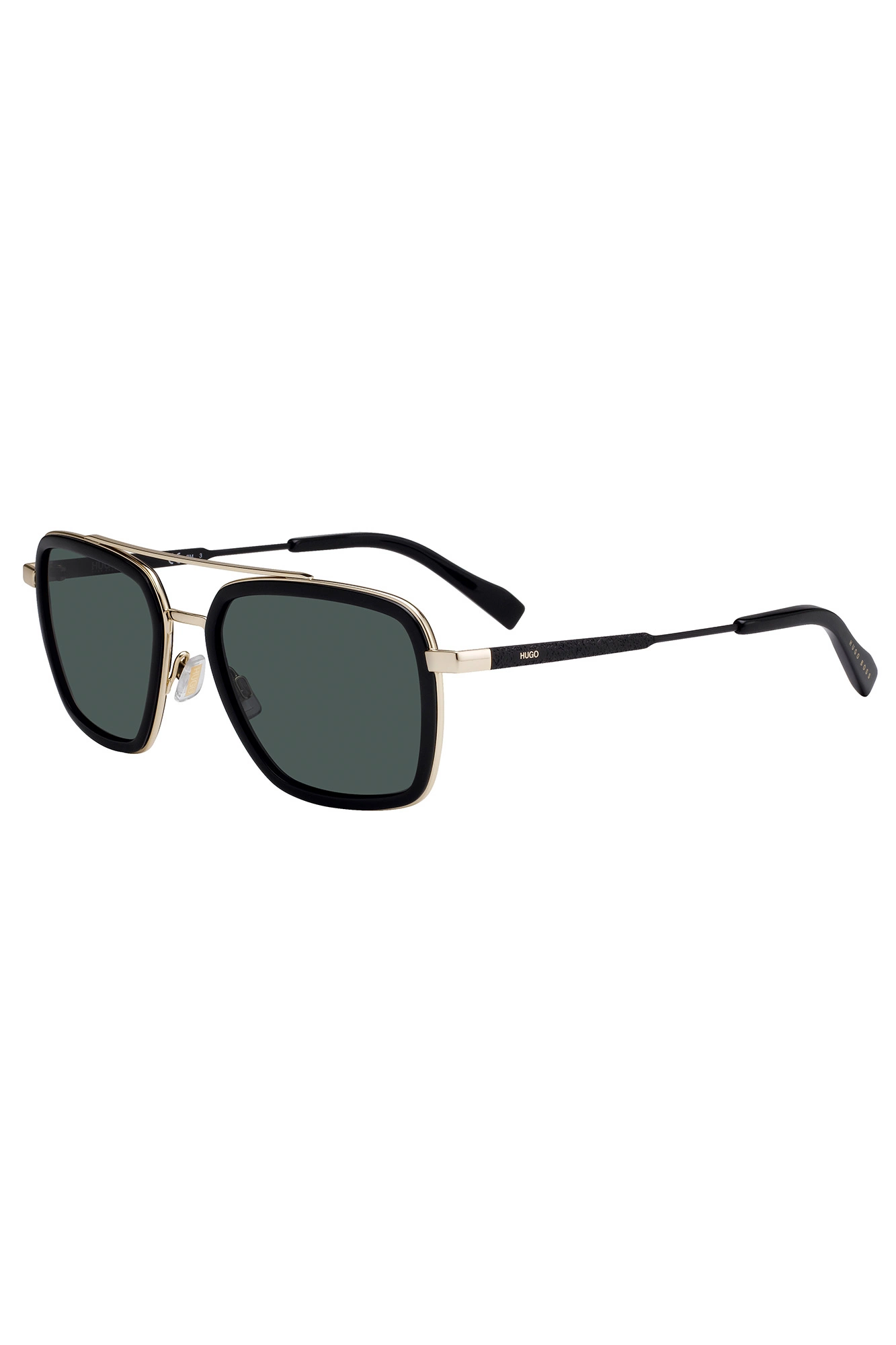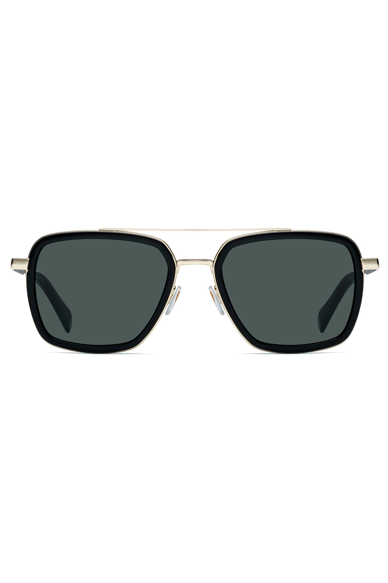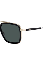 Okulary marki Hugo Boss w czarnym kolorze. Prze ciemnozielonych szkłach złote wstawki. Model typu Aviator. Wyprofilowane, sygnowane i tłoczone zauszniki z nadrukami z logo. Ruchome, sylikonowe noski. Klasyczny model w nowoczesnej odsłonie.