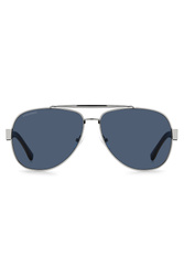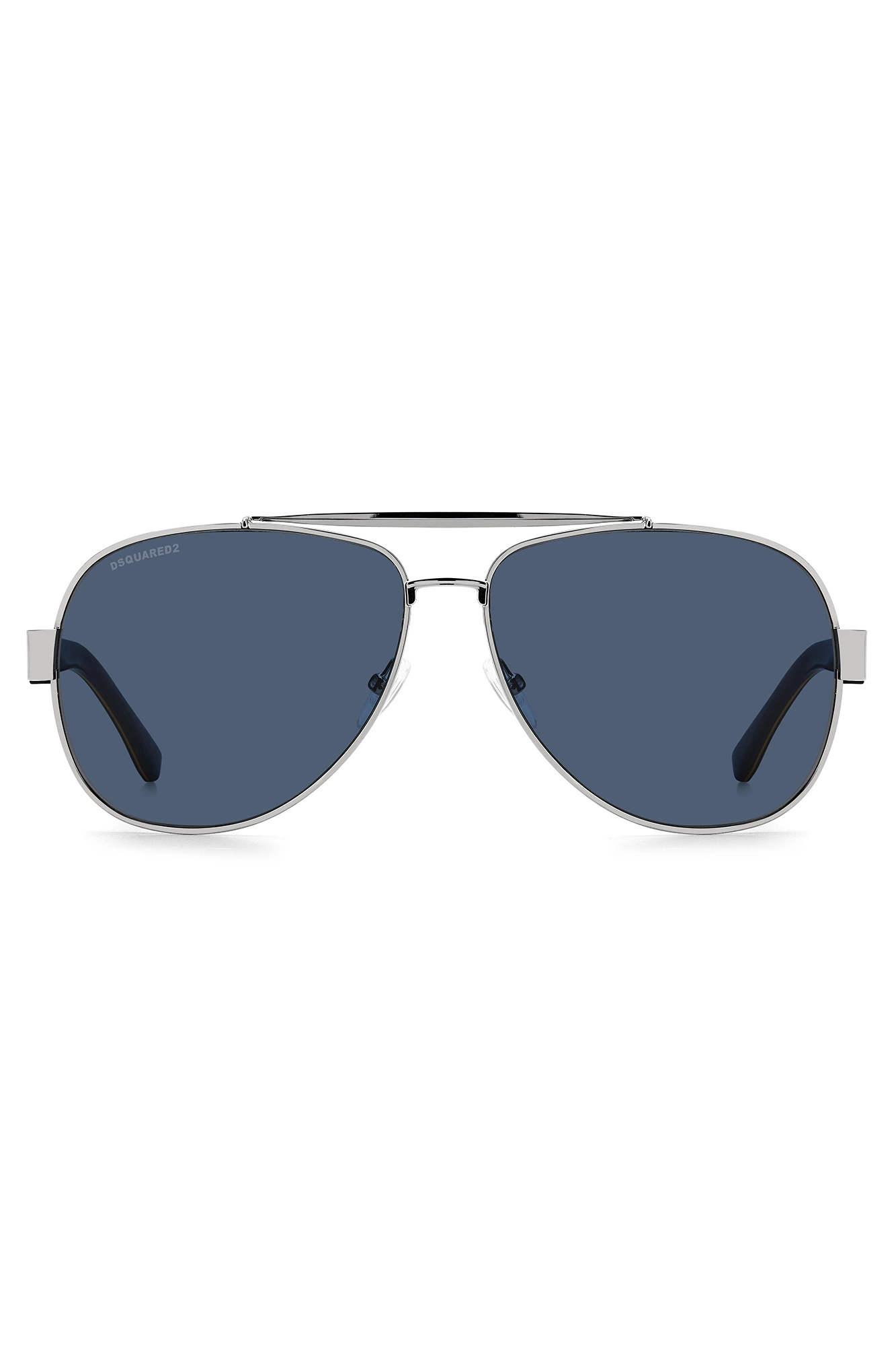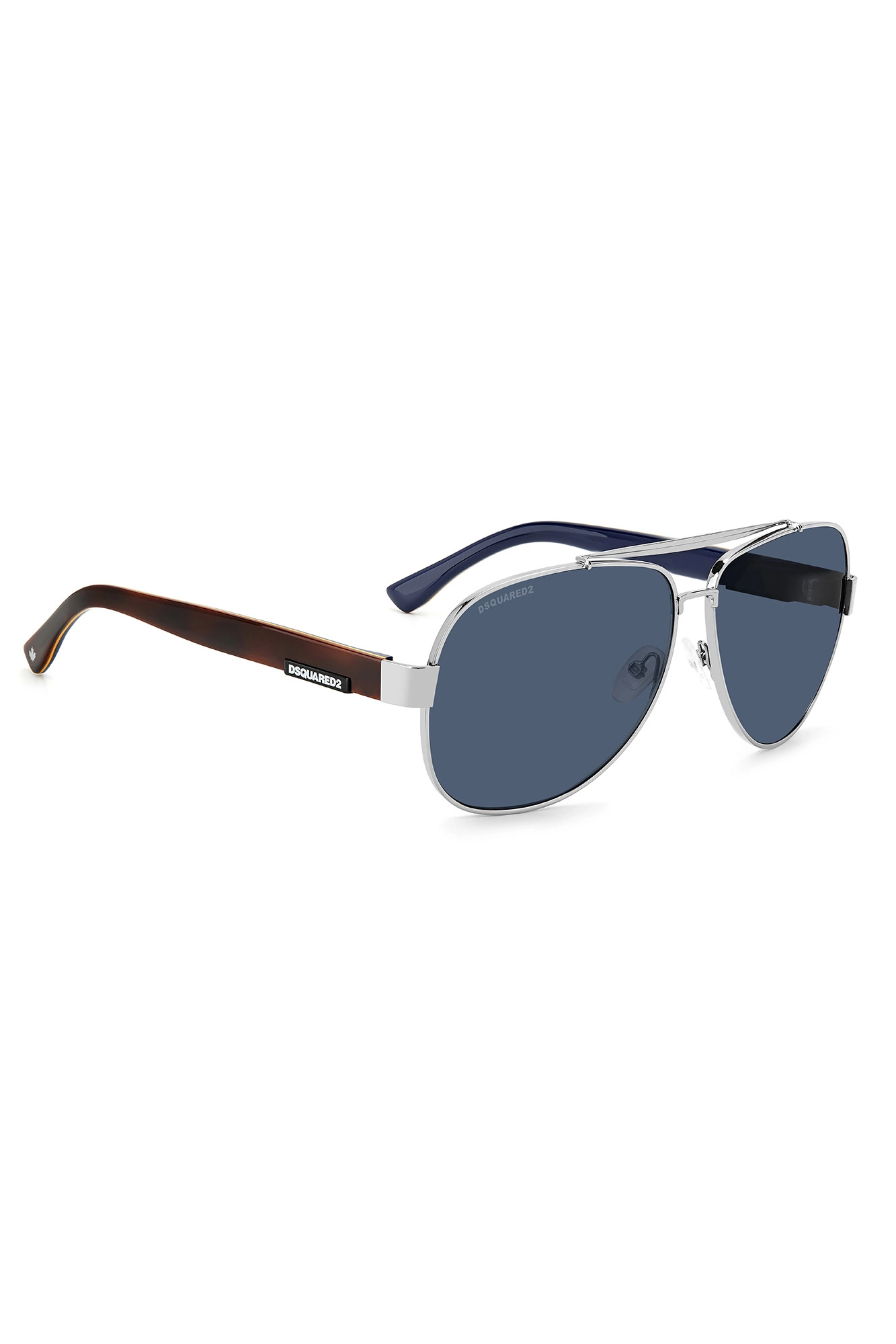 Okulary marki Dsquared2 w srebrnym kolorze. Model w typie pilotek. Wyprofilowane, brązowe zauszniki sygnowane czarno-białą wstawką z nazwą marki, zwieńczone motywem złotego liścia klonowego. Wewnątrz niebieskie. Sygnowane szkła w ciemnoniebieskim kolorze. Silikonowe, ruchome noski.