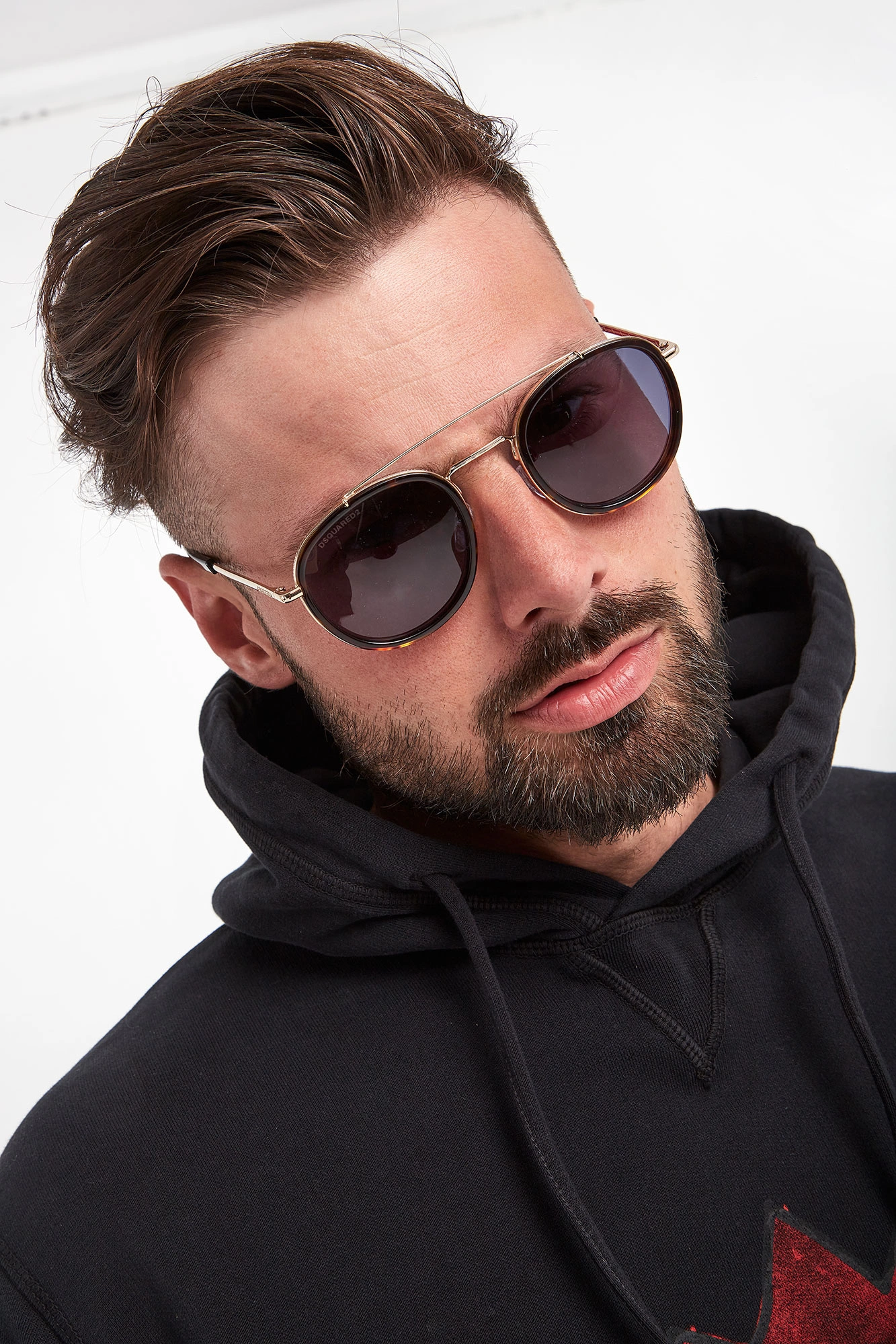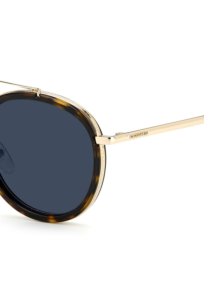 Okulary przeciwsłoneczne marki Dsquared2. Model typu Aviator. Oprawki w złotym kolorze, wykonane z metalu. Zauszniki logowane nazwą marki. Soczewki w czarnym kolorze, zapewniające doskonałą ochronę przeciwsłoneczną. Są ponadczasowe, eleganckie, doskonale pasują do miejskiego stylu. Zawsze modne oraz wykonane z ogromną dbałością o detale.