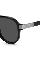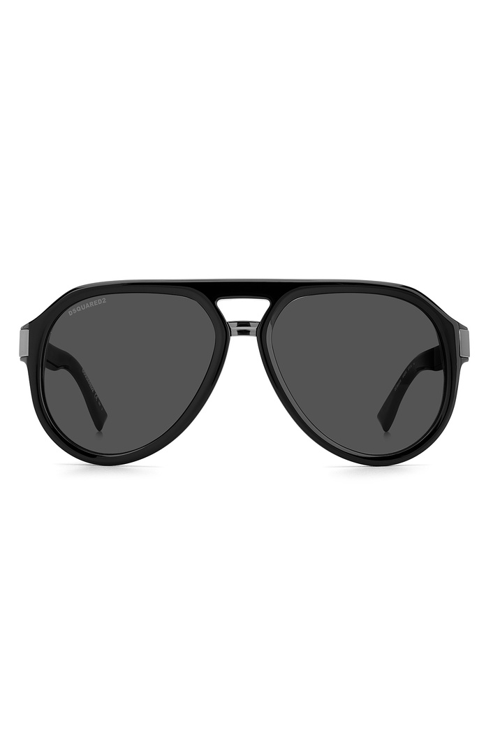 Okulary marki Dsquared2 w czarnym kolorze. Wyprofilowane, srebrno-czarne zauszniki z tłoczonym monogramem marki, zwieńczone charakterystycznym motywem liścia klonowego. Sygnowane szkła w ciemnoszarym kolorze.