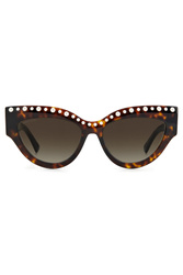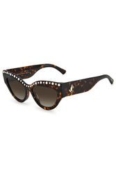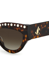 Okulary marki Jimmy Choo w brązowym kolorze. Na całości nadruk z motywem zwierzęcym. Z przodu ozdobne perły. Po boku aplikacja w złotym kolorze z monogramem marki. Zauszniki wyprofilowane, zwieńczone nadrukiem nazwy marki. Sygnowane szkła w brązowym kolorze.