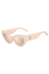 Okulary marki Jimmy Choo w beżowym kolorze. Z przodu ozdobne perły. Po boku aplikacja w złotym kolorze z monogramem marki. Zauszniki wyprofilowane, zwieńczone nadrukiem nazwy marki. Sygnowane szkła w srebrno-różowym kolorze z efektem lustrzanym.