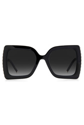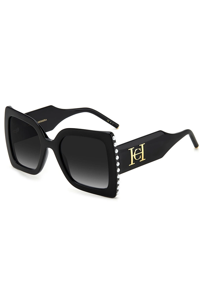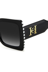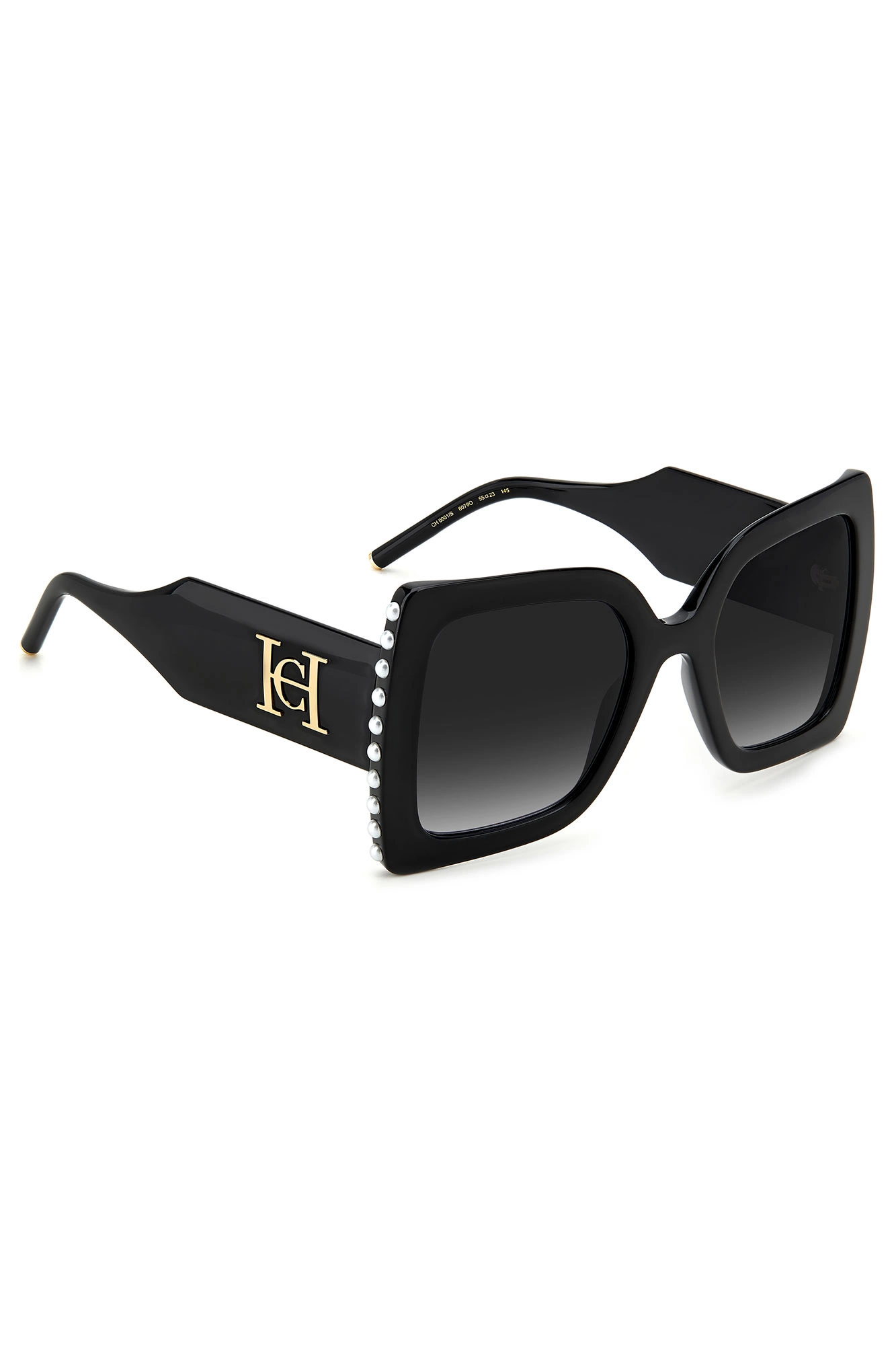 Okulary marki Carolina Herrera w czarnym kolorze. Szerokie, wyprofilowane zauszniki sygnowane złotymi monogramami. Szkła w ciemnoszarym kolorze. Oprawki ozdobione po bokach białymi perełkami. Klasyczny model z biżuteryjnym wykończeniem.