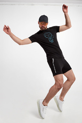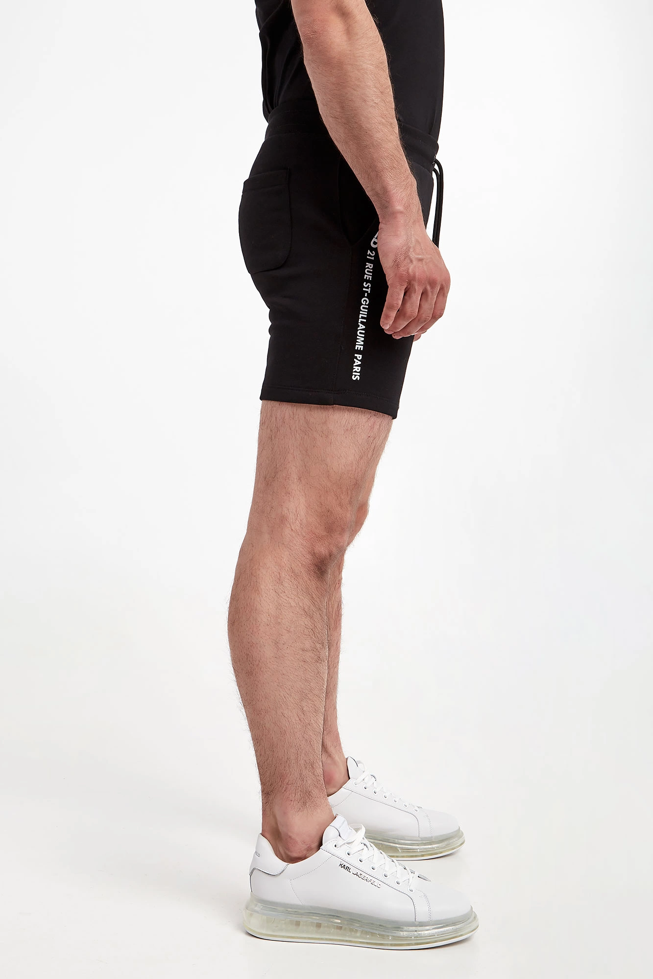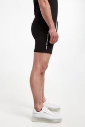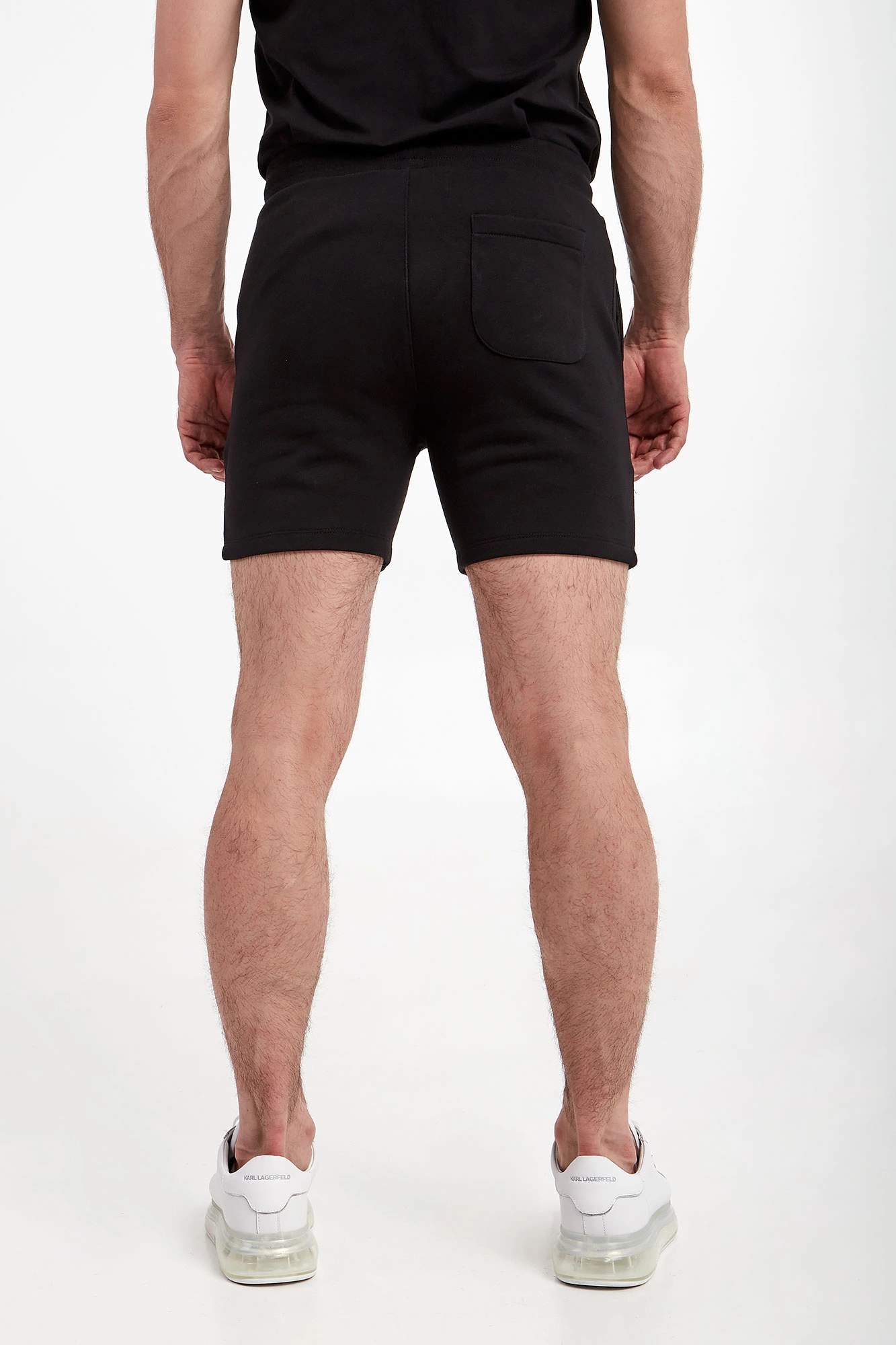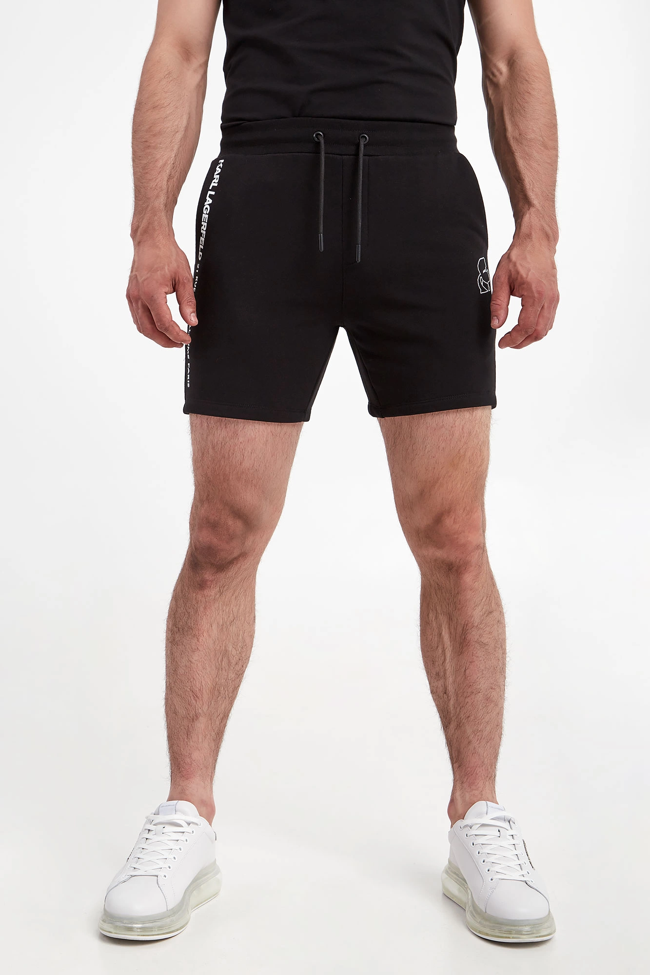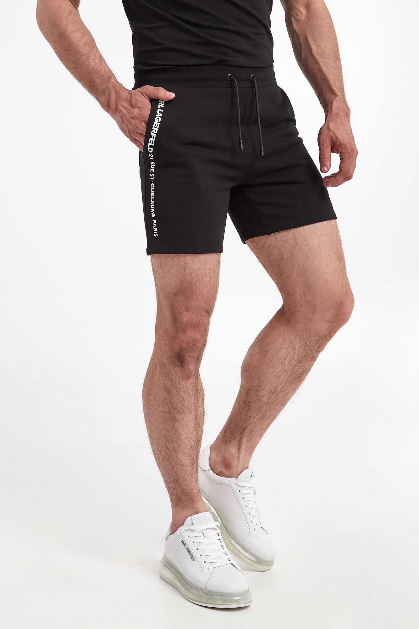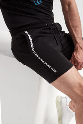Spodenki marki Karl Lagerfeld w czarnym kolorze, pochodzące z linii "Karl Cares", która wspiera zrównoważoną modę. Fason regular fit. W pasie ściągacz regulowany za pomocą troczków z sygnowanymi stoperami. Model z trzema kieszeniami. Na nogawkach białe nadruki z logo oraz wizerunkiem założyciela marki. Wykonane z elastycznej, bawełnianej tkaniny.