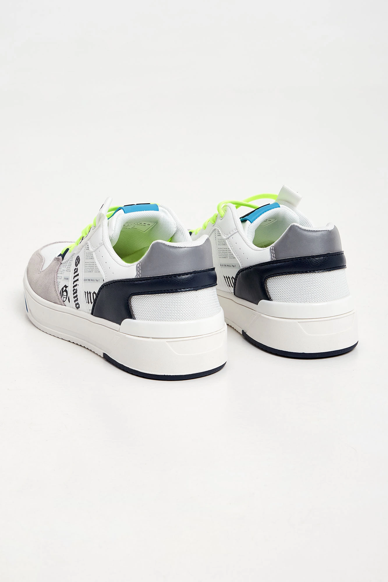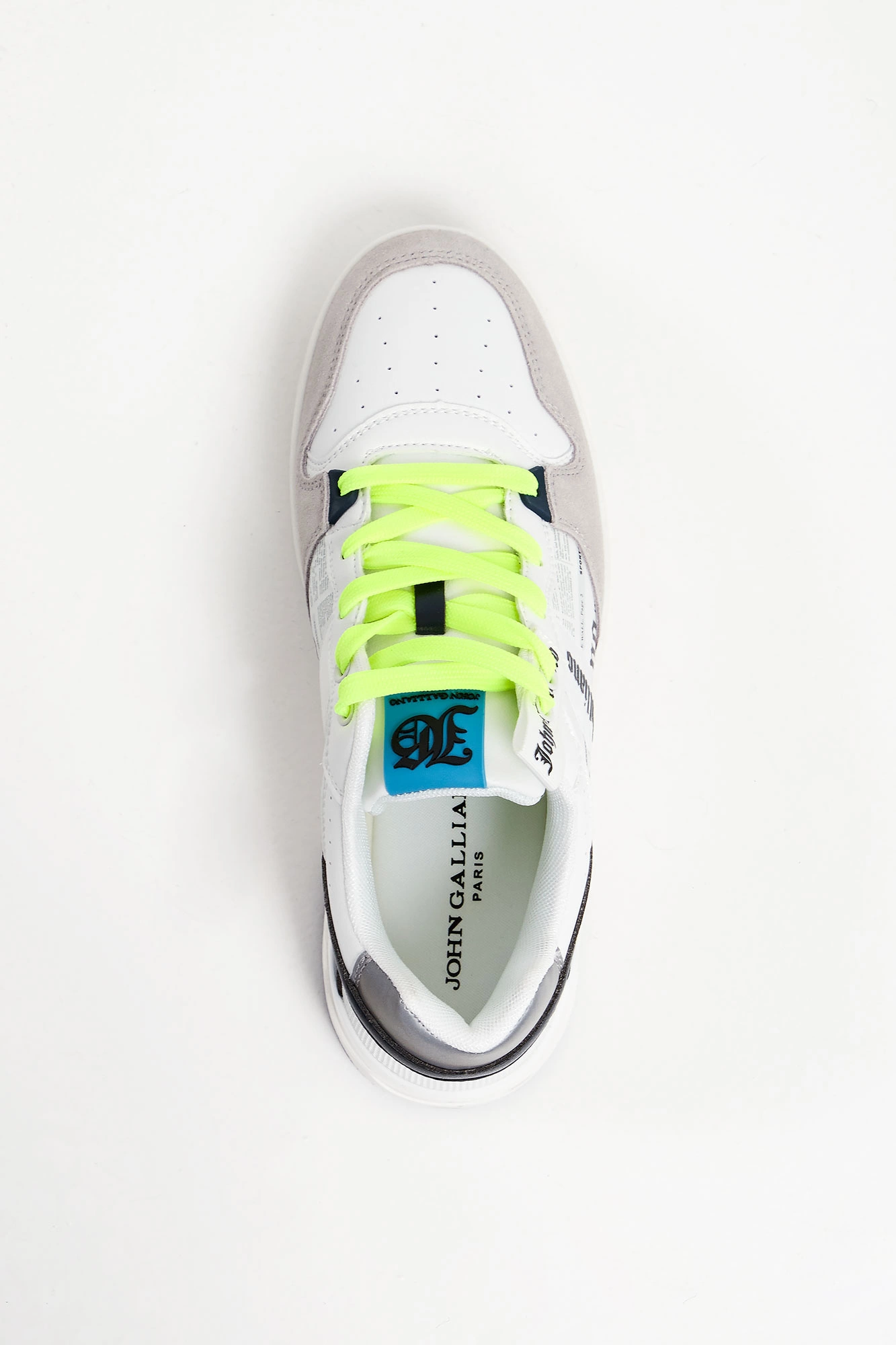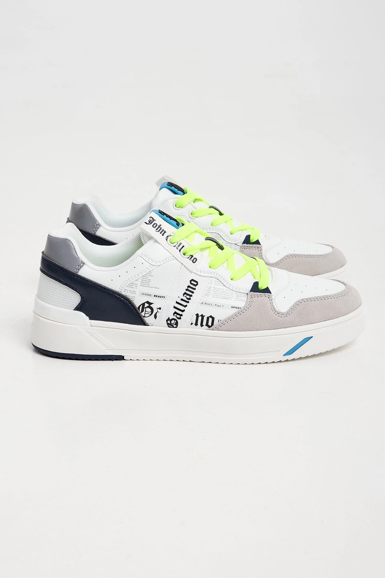 Sneakersy marki John Galliano w białym kolorze. Wiązane za pomocą neonowych sznurówek. Po bokach czarno-szare, gazetowe nadruki. Na noskach szare, zamszowe wstawki i dziurkowania. Z tyłu wstawki odblaskowe oraz z granatowej skóry. Na językach błękitno-czarne naszywki z logo marki. Biało-granatowa podeszwa.