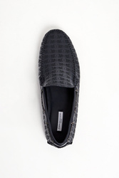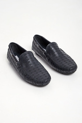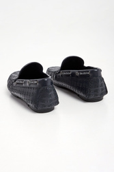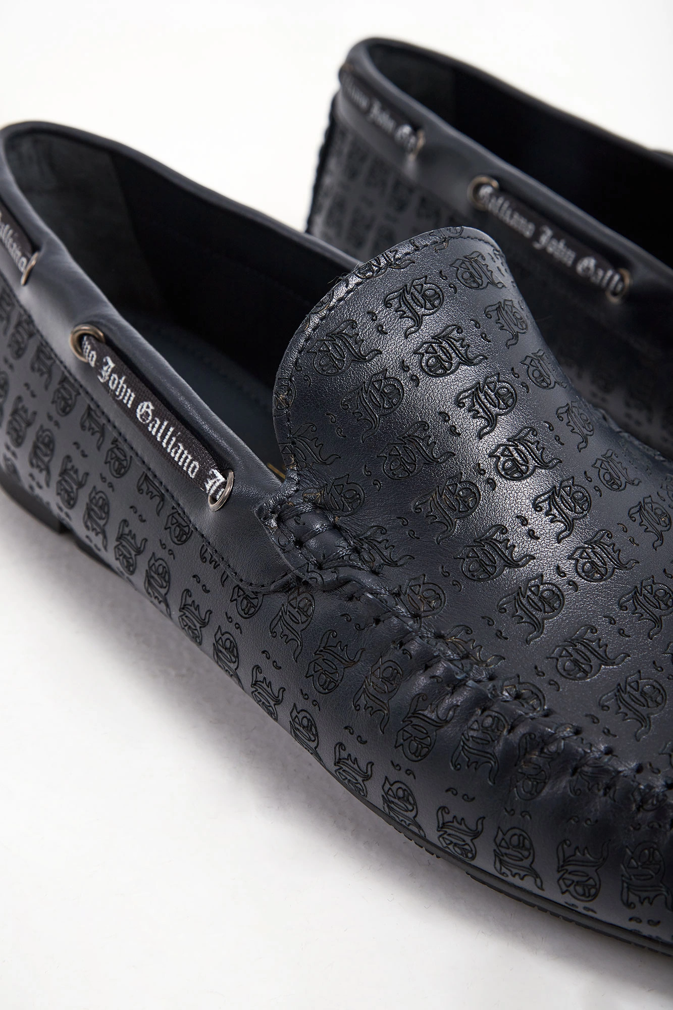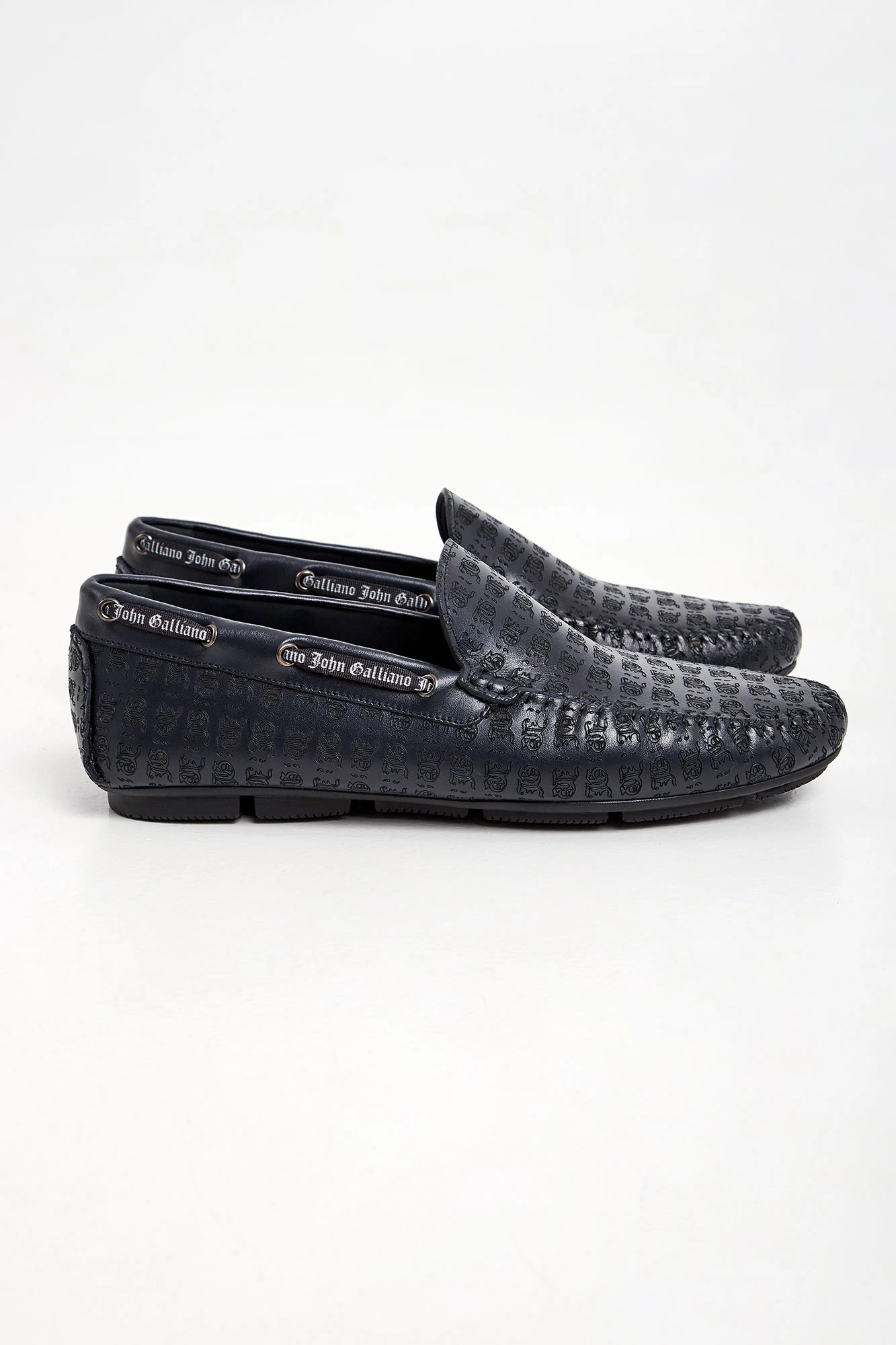 Mokasyny marki John Galliano w granatowym kolorze. Na całości tłoczony wzór z monogramem marki. Wykonane ze skóry naturalnej. Po bokach czarne ściągacze ozdobione białym pismem gotyckim. Zaokrąglone noski ozdobione przeszyciami. W środku sygnowana metka.