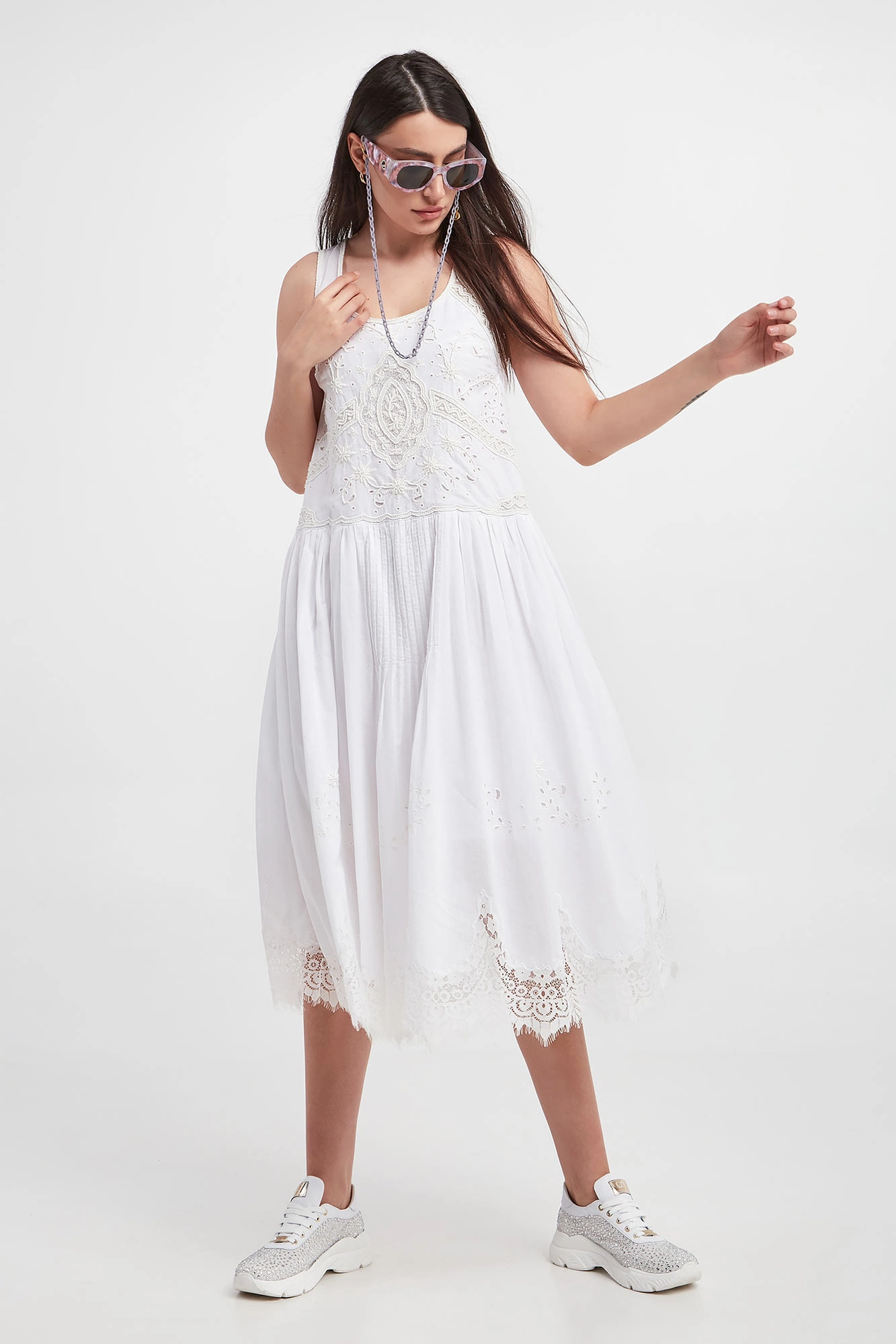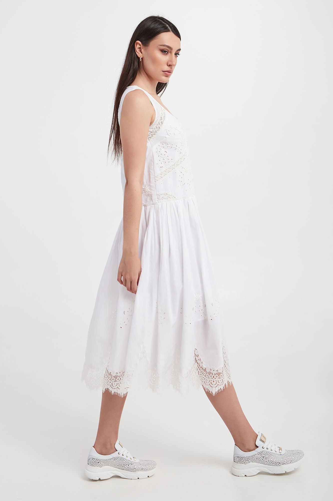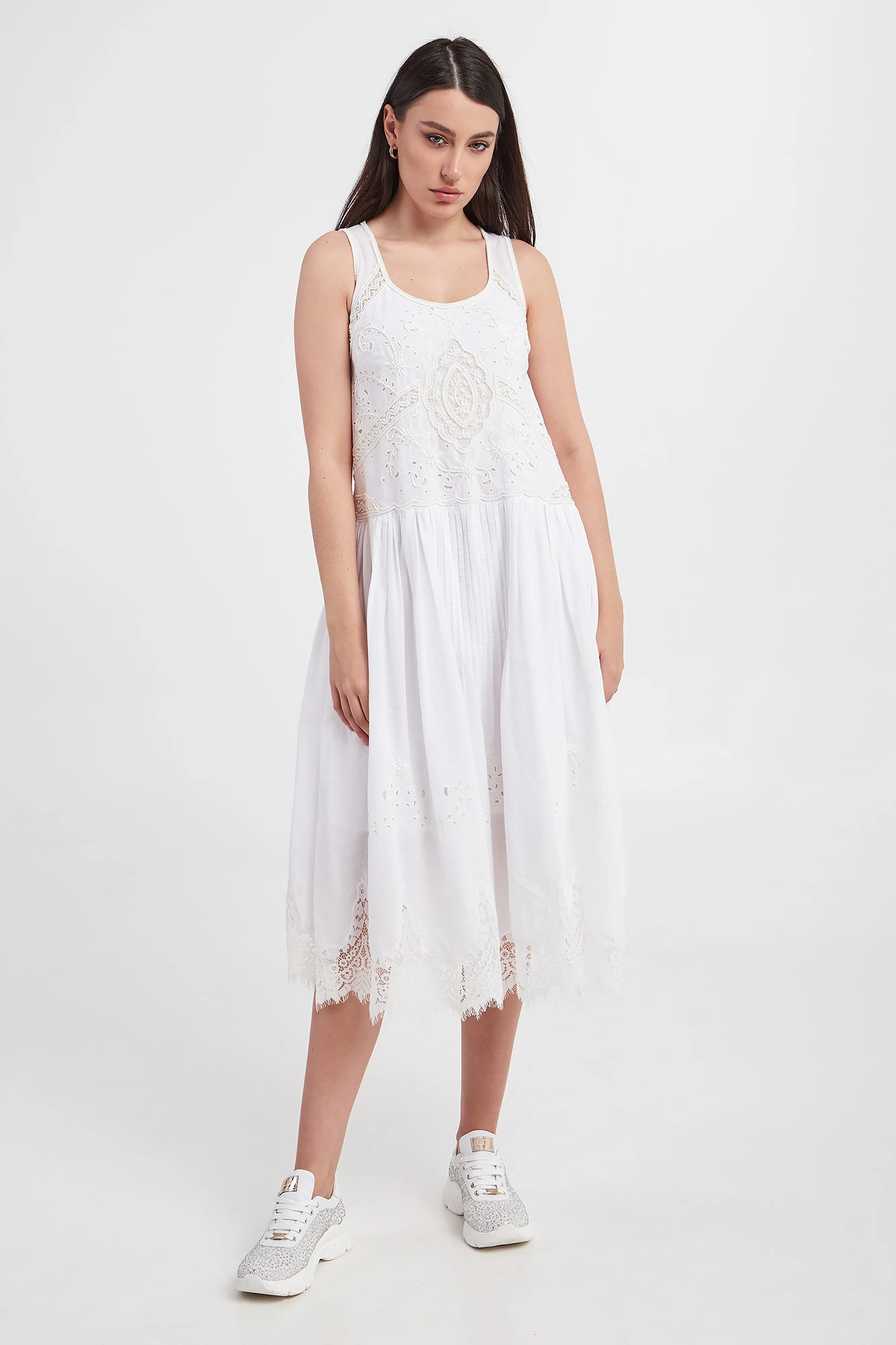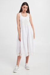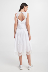 Sukienka marki Twinset w białym kolorze. Fason typu regular fit o długości midi. Dekolt typu o-neck zapinany z tyłu za pomocą niewielkiego guzika. Na całości ozdobne kamyczki, hafty i koronki. Dół rozkloszowany, plisowany. Z tyłu metalowa aplikacja w kształcie logo marki z tłoczeniem. Wykonana z czystej bawełny.