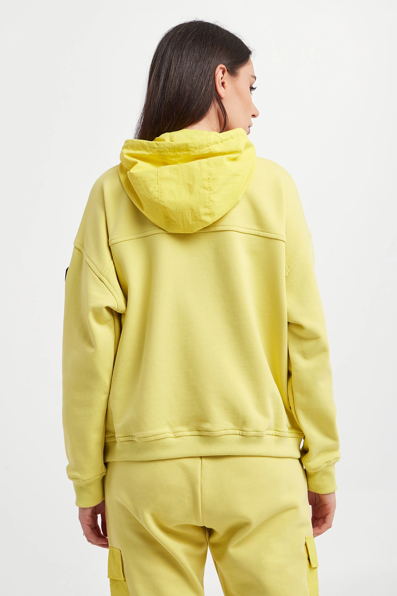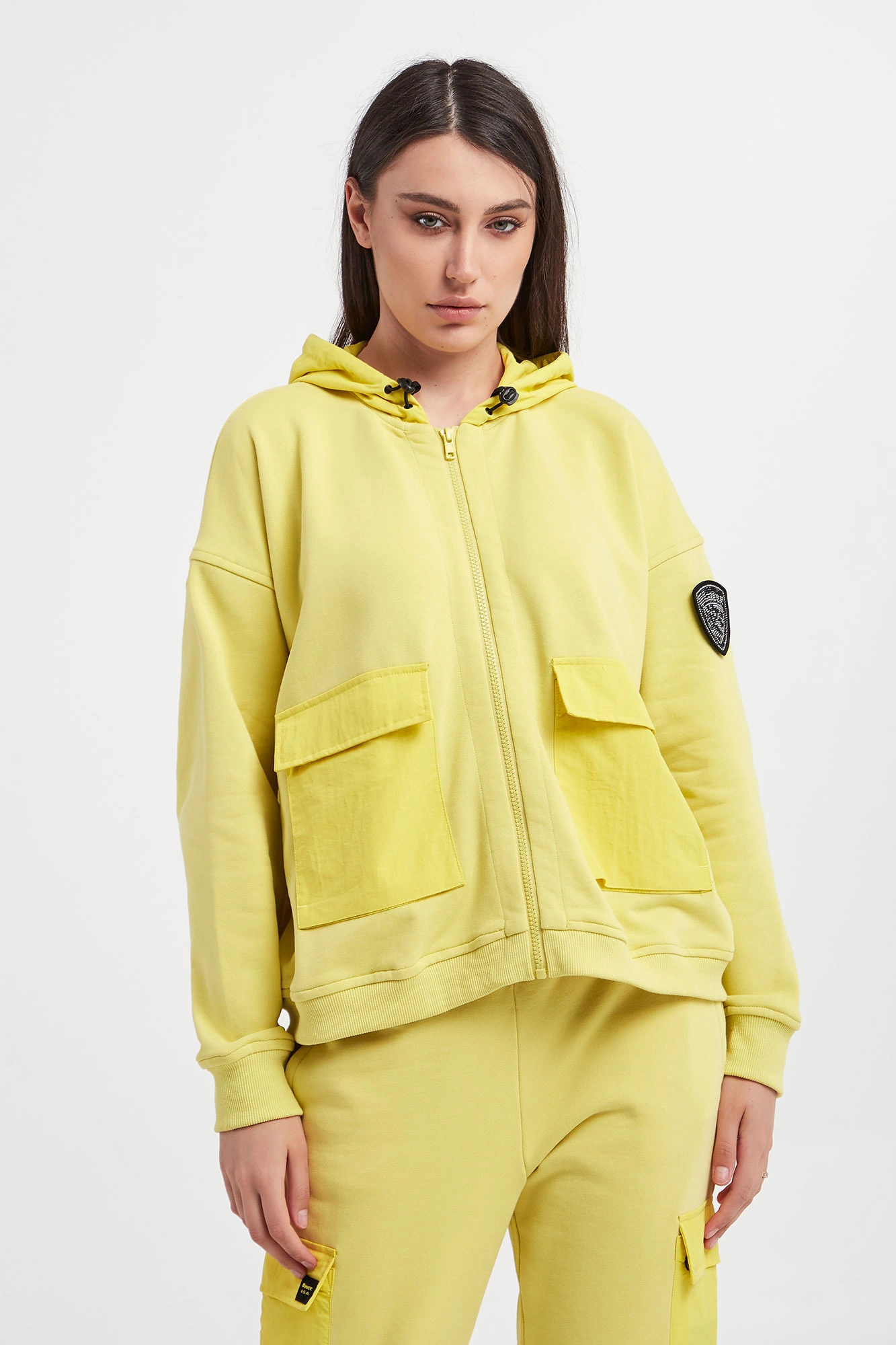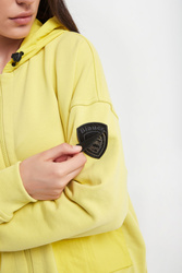 Bluza marki Blauer w cytrynowym kolorze. Fason typu relaxed fit. Z kapturem regulowanym za pomocą elastycznych troczków ze stoperem w czarnym kolorze. Zapinany za pomocą zamka błyskawicznego. Obniżona linia ramion. Długie rękawy i dół wykończone elastycznym ściągaczem. Model z dwoma kieszeniami z patką, zapinanymi za pomocą nap. Na lewym rękawie naszywka wykończona cyrkoniami z możliwością odpięcia.
