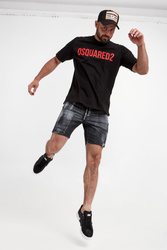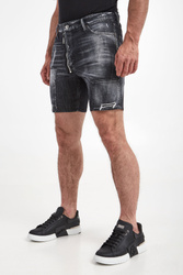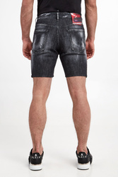 Spodenki jeansowe marki Dsquared2 w ciemnoszarym kolorze. Autorski fason marine short. W pasie szlufki. Model z pięcioma kieszeniami. Zapinane za pomocą sygnowanych guzików w srebrnym kolorze. Z przodu ozdobny zamek błyskawiczny. Na całości przetarcia i strzępienia. Z tyłu wielokolorowa naszywka z nazwą marki. Wykonane z nieco elastycznej bawełny.
