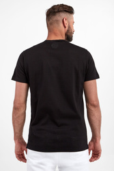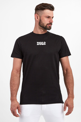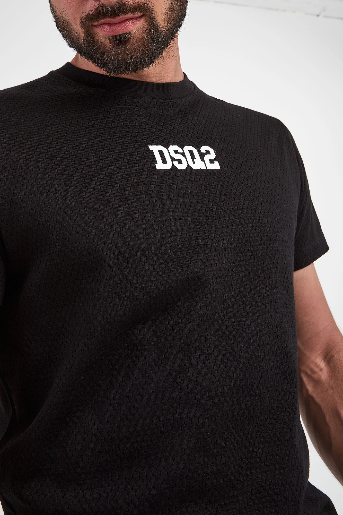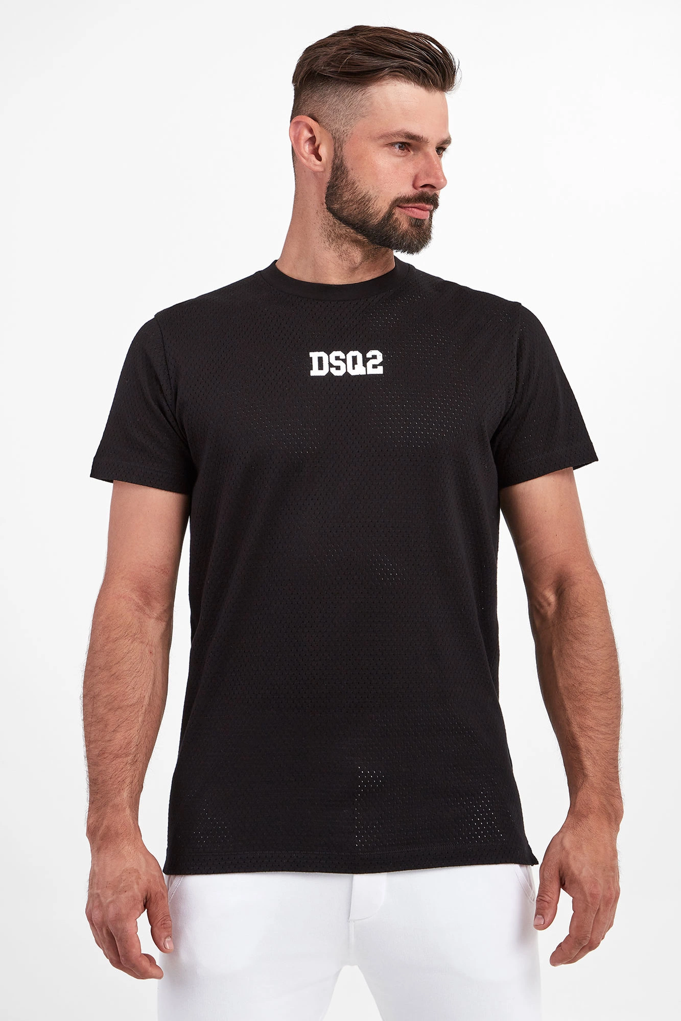 T-shirt marki Dsquared2 w czarnym kolorze. O nieco dłuższym fasonie typu regular fit. Po bokach delikatne rozcięcia. Z przodu nadruk w postaci logo marki w białym kolorze. Dekolt o-neck wykończony ściągaczem. Krótkie rękawy i dół zakończone lamówką. W całości wykonany z tkaniny dziurkowanej, bawełnianej.