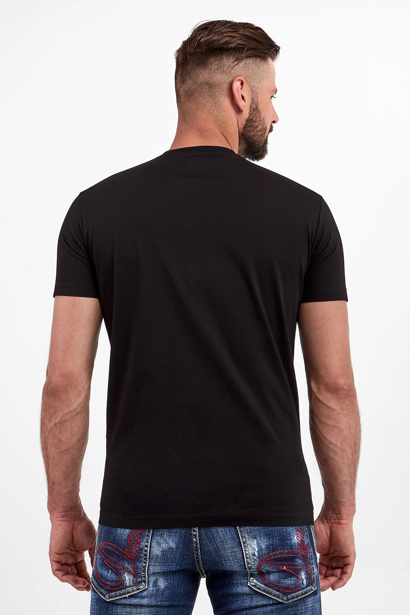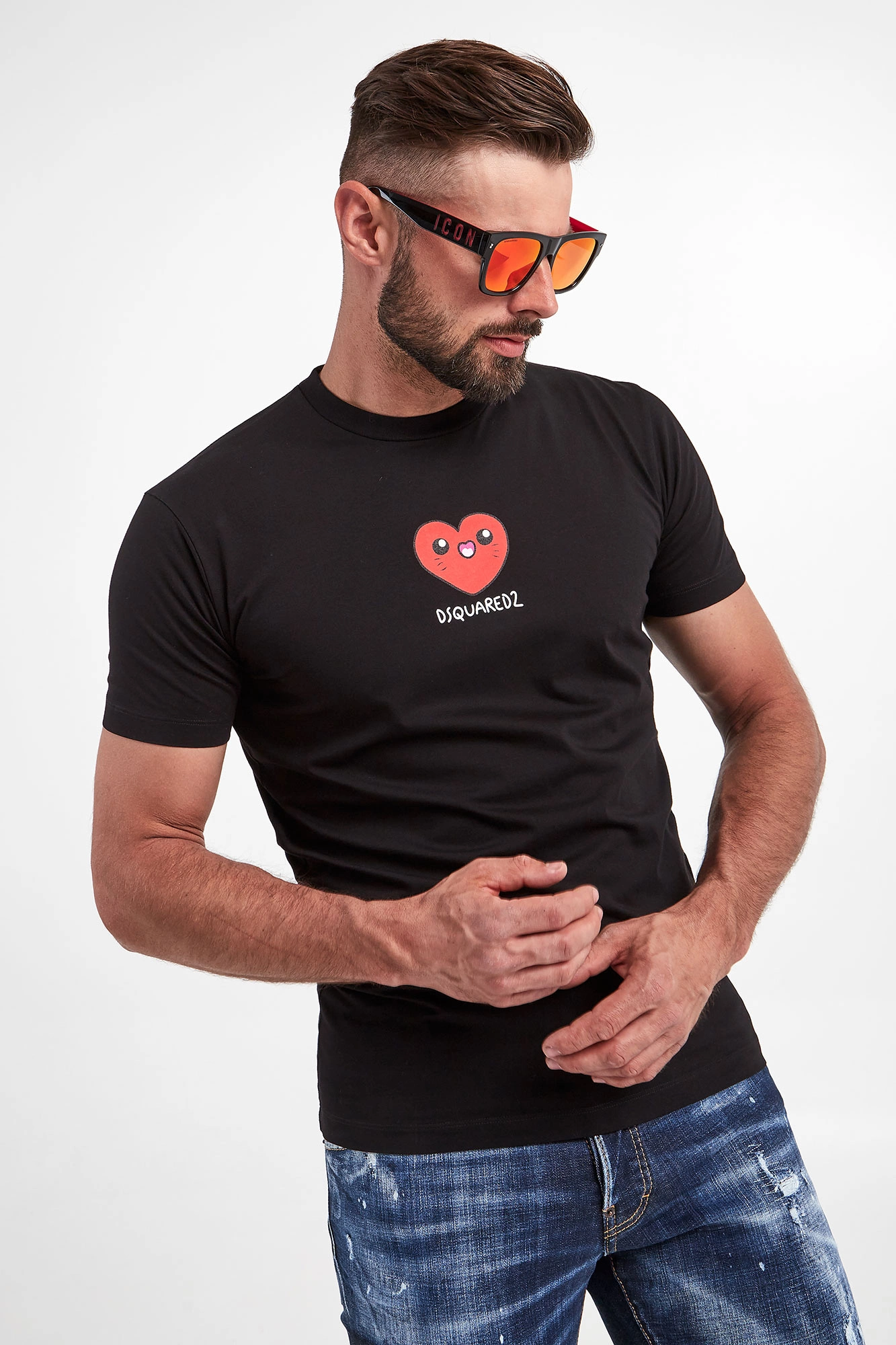 T-shirt marki Dsquared2 w czarnym kolorze. Fason typu regular fit. Dekolt typu o-neck zakończony ściągaczem. Krótkie rękawy i dół wykończone lamówką. Z przodu napis w białym kolorze w postaci nazwy marki oraz czerwony nadruk z motywem serca. W całości wykonany z tkaniny bawełnianej.