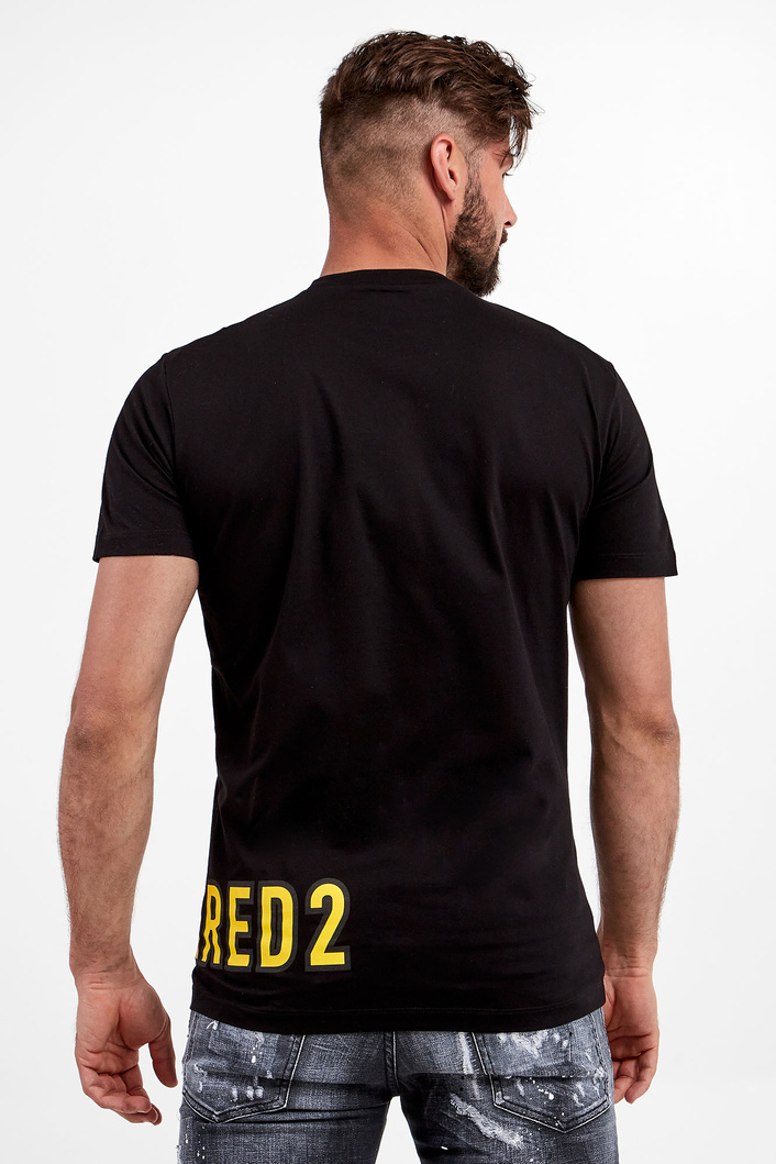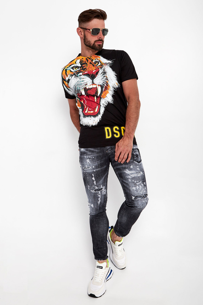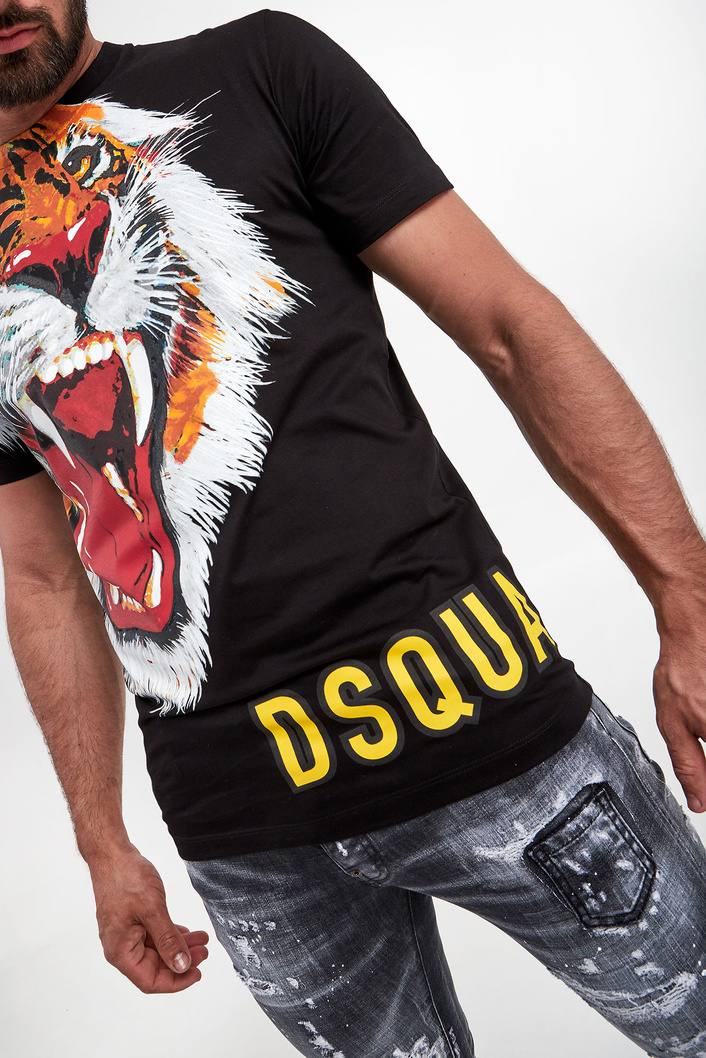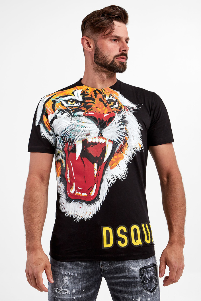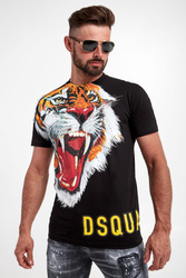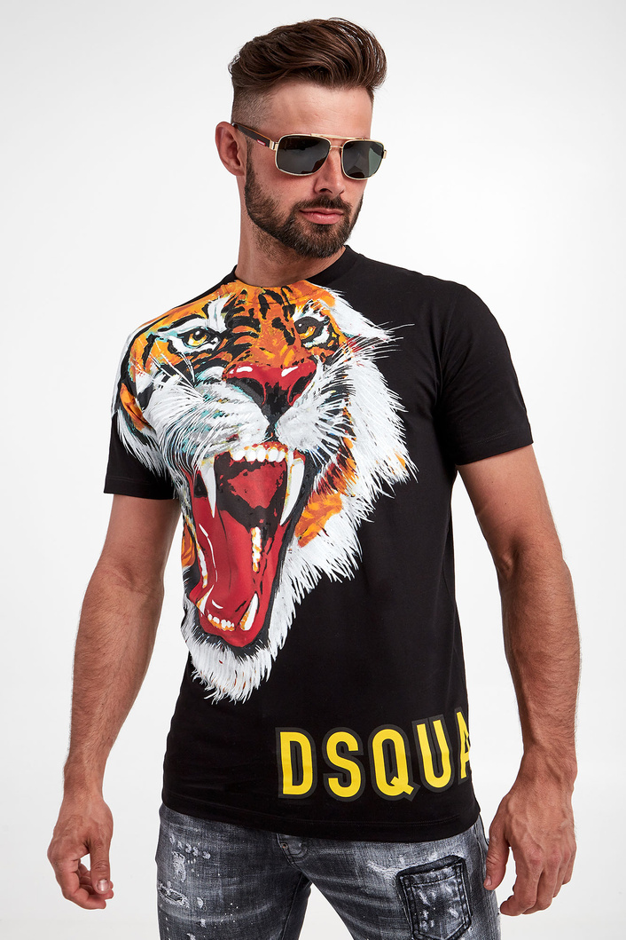 T-shirt marki Dsquared2 w czarnym kolorze. Fason typu regular. Dekolt typu o-neck wykończony ściągaczem. Krótkie rękawy i dół zakończone lamówką. Z przodu nadruk z motywem tygrysa i w postaci nazwy marki w żółtym kolorze zachodzący na tył t-shirtu. W całości wykonany z tkaniny bawełnianej.