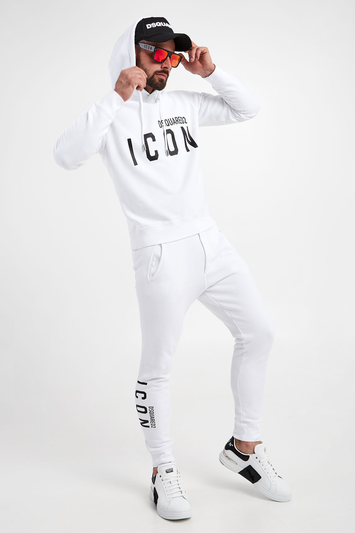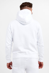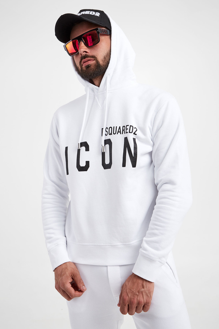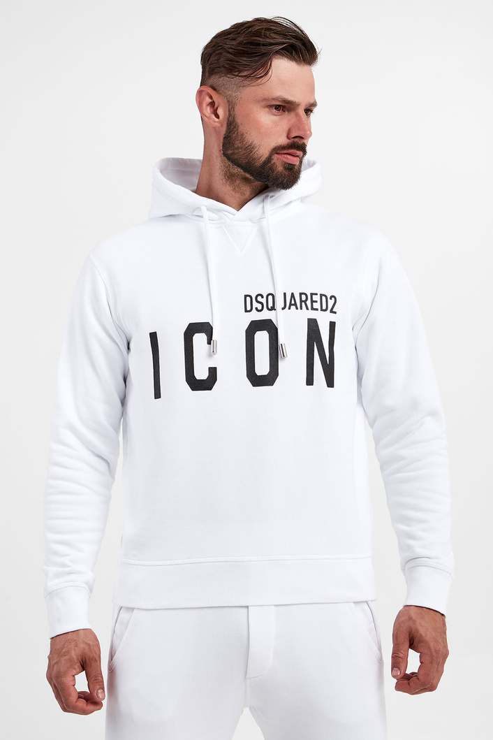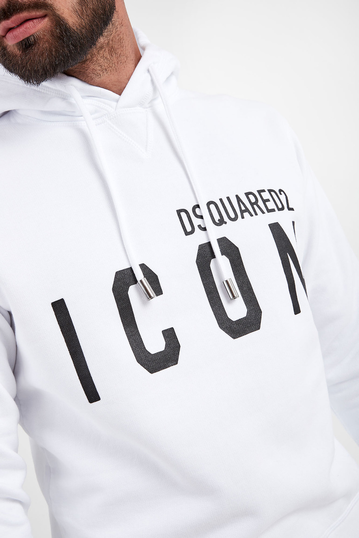 Bluza z kapturem marki Dsquared2 w białym kolorze. Fason typu regular fit. Kaptur regulowany za pomocą troczków zakończonych srebrną końcówką. Z przodu duży napis w postaci nazwy marki w czarnym kolorze. Dół i rękawy wykończone ściągaczem prążkowanym. W całości wykonana z tkaniny bawełnianej.