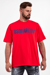 T-shirt marki Dsquared2 w czerwonym kolorze. Fason typu regular. Dekolt typu o-neck zakończony ściągaczem. Krótkie rękawy i dół wykończone lamówką. Z przodu nadruk w granatowym kolorze w postaci nazwy marki. Po bokach delikatne rozcięcia. W całości wykonany z tkaniny bawełnianej.
