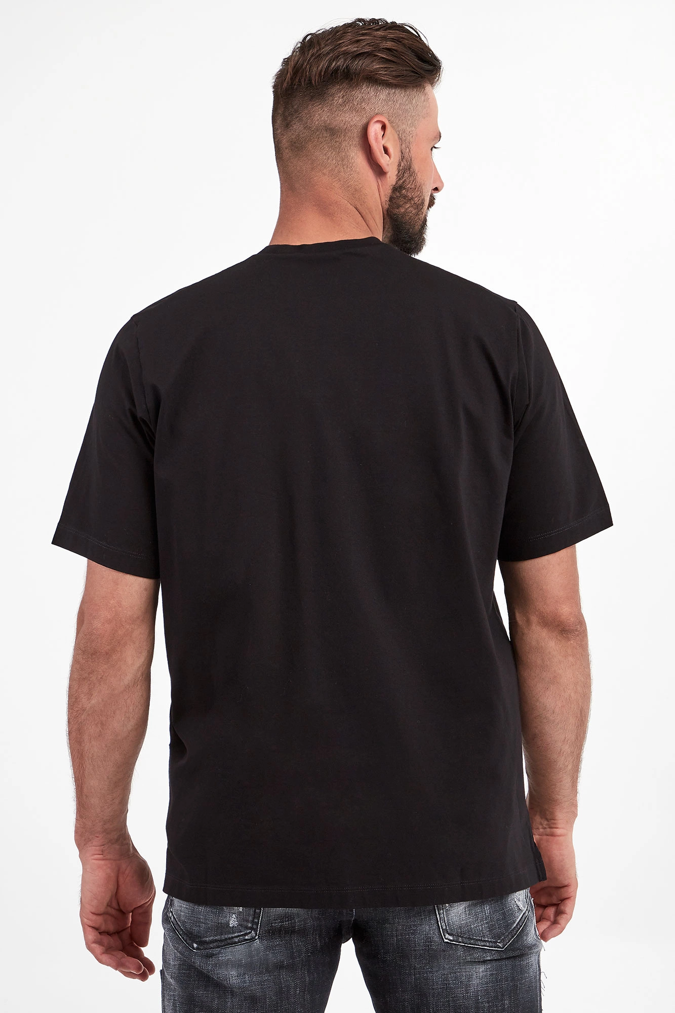T-shirt marki Dsquared2 w czarnym kolorze. Fason typu regular. Dekolt typu o-neck wykończony ściągaczem. Krótkie rękawy i dół zakończone lamówką. Z przodu nadruk w czerwonym kolorze w postaci nazwy marki. Po bokach delikatne rozcięcia. W całości wykonany z tkaniny bawełnianej.