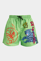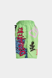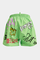 Szorty kąpielowe marki Dsquared2 w kolorze zielonym. Na całych spodenkach kolorowe grafiki. Fason regular fit. Po bokach dwie wpuszczane kieszenie. W pasie ściągacz oraz troczki do dodatkowej regulacji.