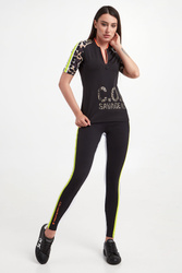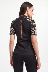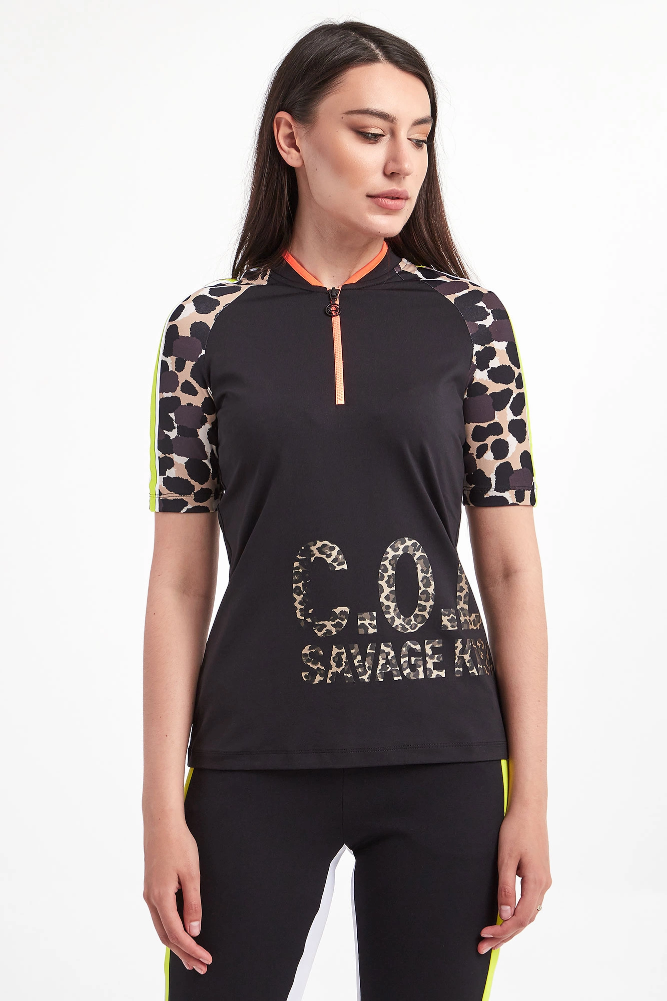 T-shirt marki Sportalm w czarnym kolorze. Fason typu slim. Raglanowe krótkie rękawki. Na rękawach lampas w limonkowym kolorze oraz widoczny z przodu i z tyłu nadruk w cętki. Dekolt zakończony ściągaczem w czarno-pomarańczowym kolorze oraz zapinany na pomarańczowy zamek z czarną, sygnowaną zawieszką. Z przodu napis w cętki. Z tyłu pomarańczowy napis z logo. Dół oraz rękawki wykończone lamówką.