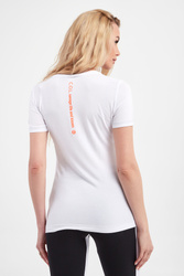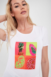 T-shirt marki Sportalm w białym kolorze. Fason typu slim. Z przodu wielokolorowa naszywka ozdobiona cekinami i koralikami. Na naszywce motyw owoców. Na dole i przy rękawach ozdobne przeszycie w srebrnym kolorze. Dekolt o-neck wykończony ściągaczem. Z tyłu napis i logo marki w pomarańczowym kolorze.