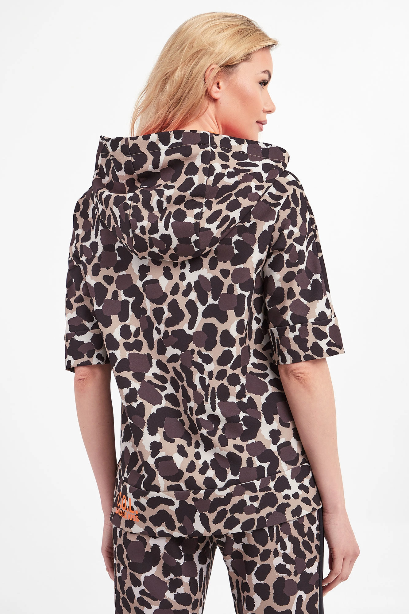Kurtka marki Sportalm w brązowo-czarnym kolorze. Fason typu regular fit. Z kapturem regulowanym za pomocą sygnowanych troczków w czarnym kolorze. Zapinana za pomocą dwukierunkowego zamka błyskawicznego. Krótkie rękawy i dół wykończone szeroką lamówką. Model z dwoma kieszeniami, zapinanymi za pomocą zamka. Po bokach czarne lampasy.