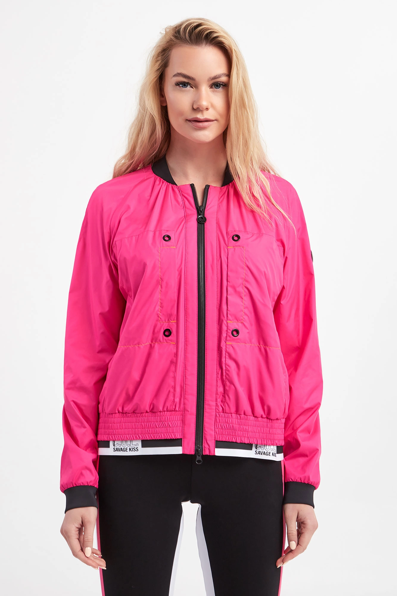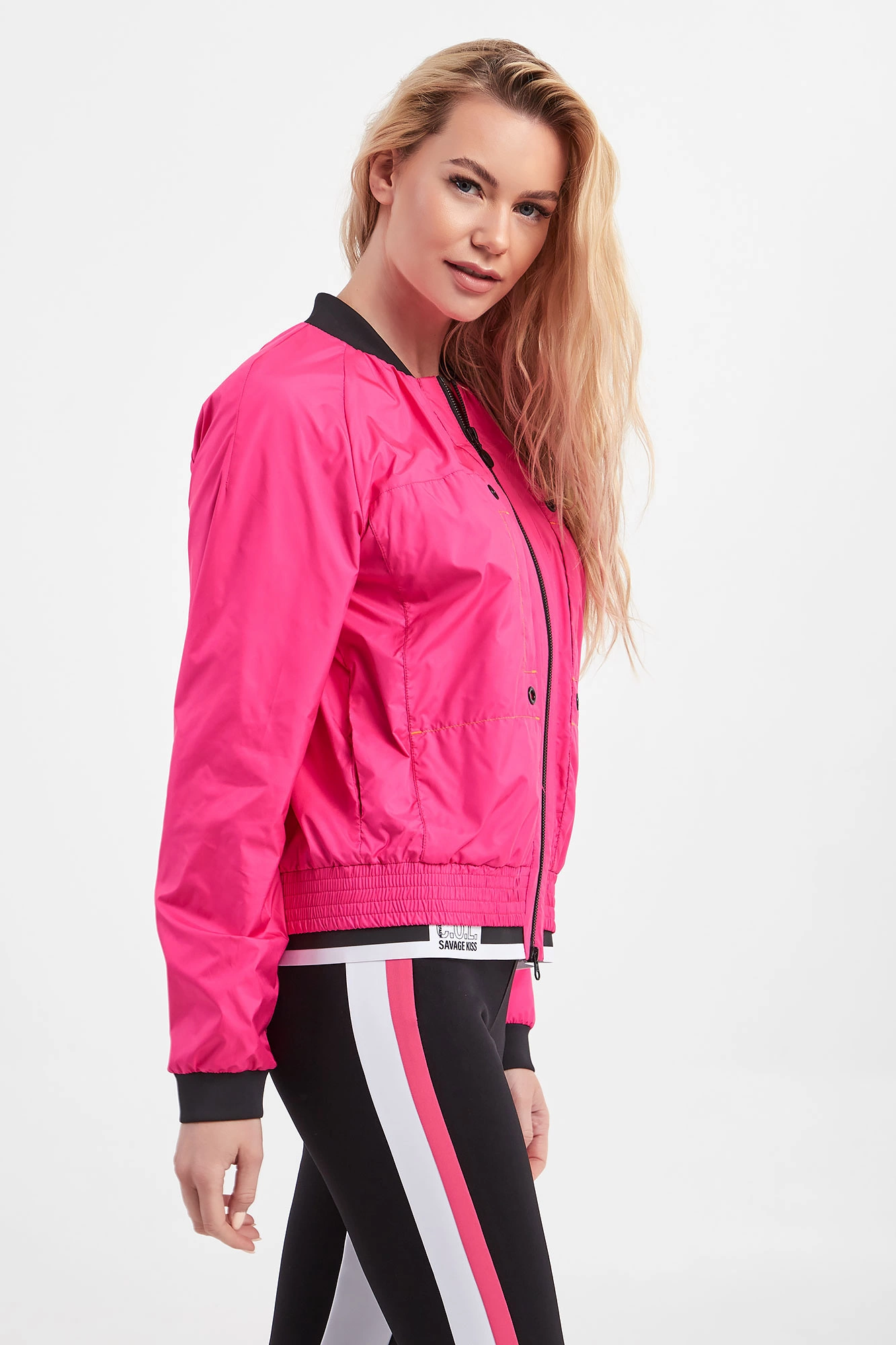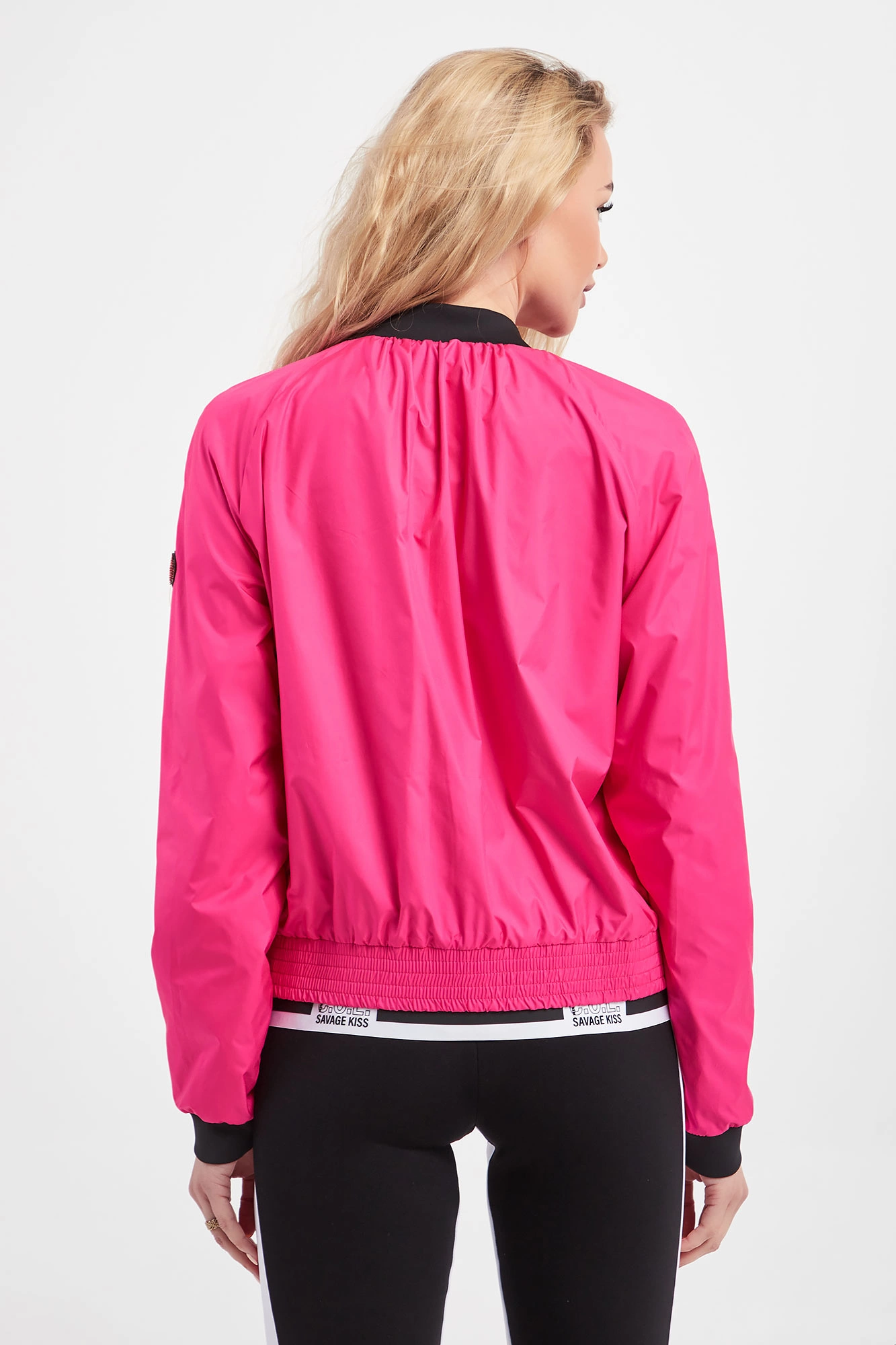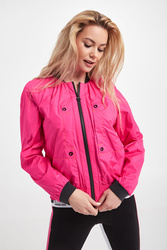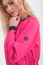 Kurtka marki Sportalm w intensywnym, różowym kolorze. Bomberka. Fason typu regular fit. Kołnierz i długie rękawy wykończone ściągaczem w czarnym kolorze. Zapinana za pomocą dwukierunkowego zamka w czarnym kolorze. Model z czterema kieszeniami. Dół wykończony elastycznym ściągaczem i sygnowaną tasiemką w biało-czarnym kolorze. Na lewym rękawie gumowa naszywka z logo marki.