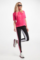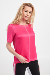 T-shirt marki Sportalm w różowym kolorze. Fason typu regular fit. Wykonana z dwóch różnych materiałów. Z przodu śliski, satynowy materiał. Tył i rękawy wykonane z tkaniny wiskozowej. Dekolt typu o-neck. Przy dekolcie, rękawach i na dole dekoracyjne, srebrne przeszycia. Po bokach delikatne rozcięcia. Z tyłu na linii karku srebrna aplikacja w postaci logo marki. Tył nieco dłuższy od przodu.