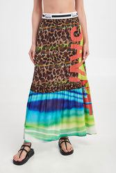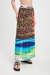 Spódnica marki Sportalm. Na całości wzór z motywem zwierzęcym i wielokolorowe paski. Dół wykończony falbaną. Fason regular o długości midi. W talii elastyczny ściągacz w białym kolorze z gumowanym, czarnym nadrukiem. Zwiewna i lekka. Wykonana z czystej wiskozy.