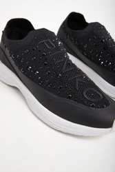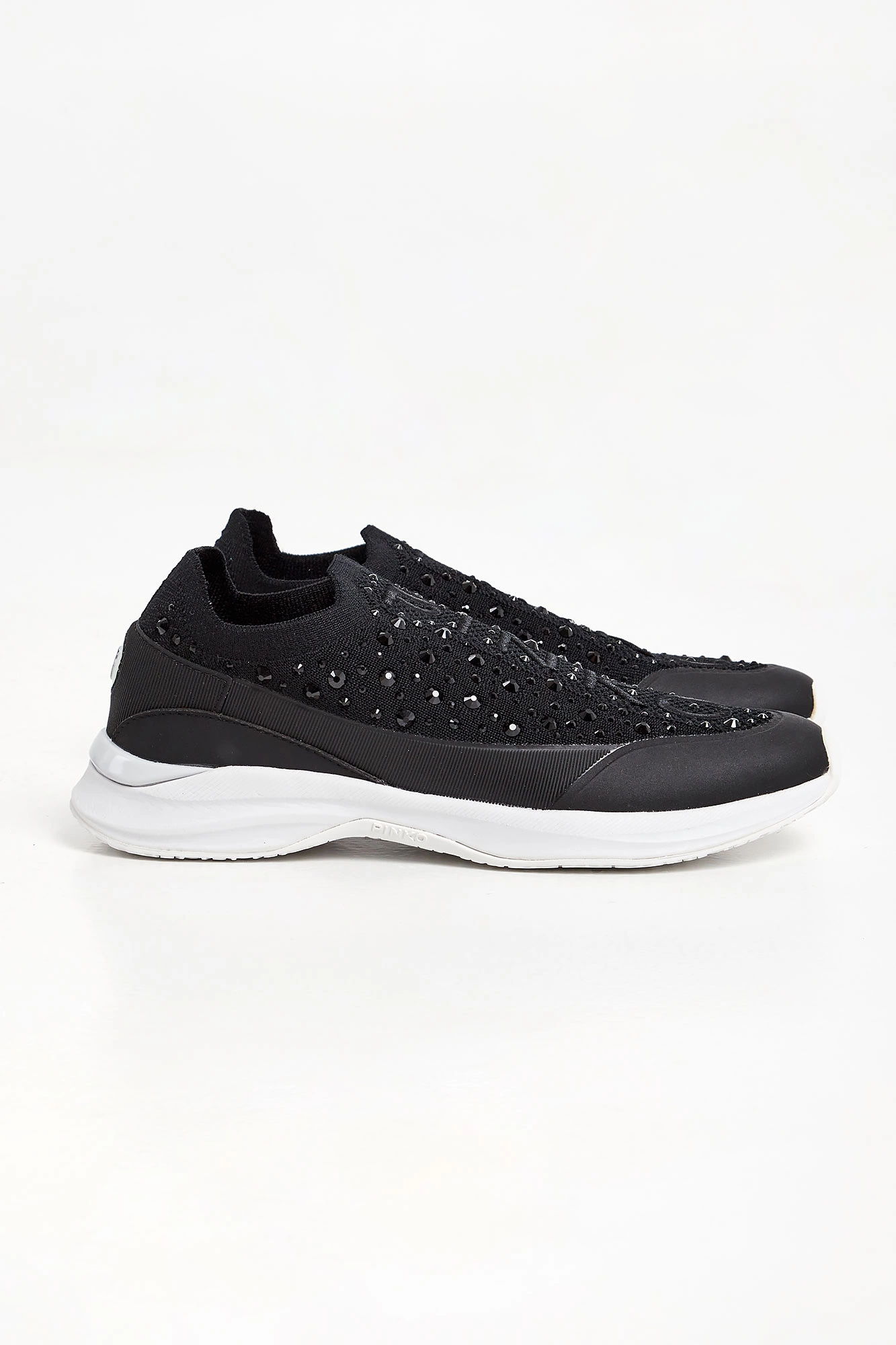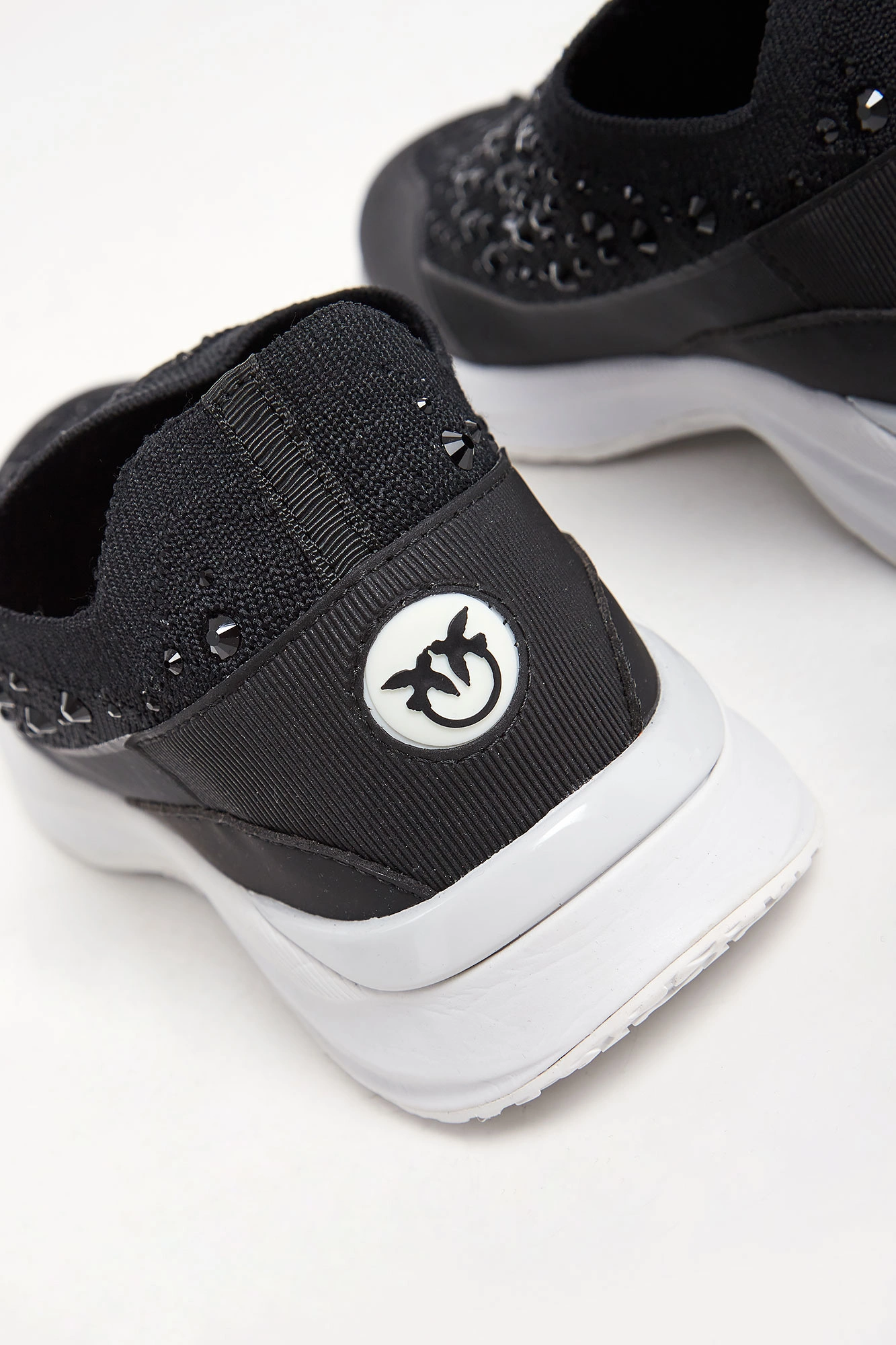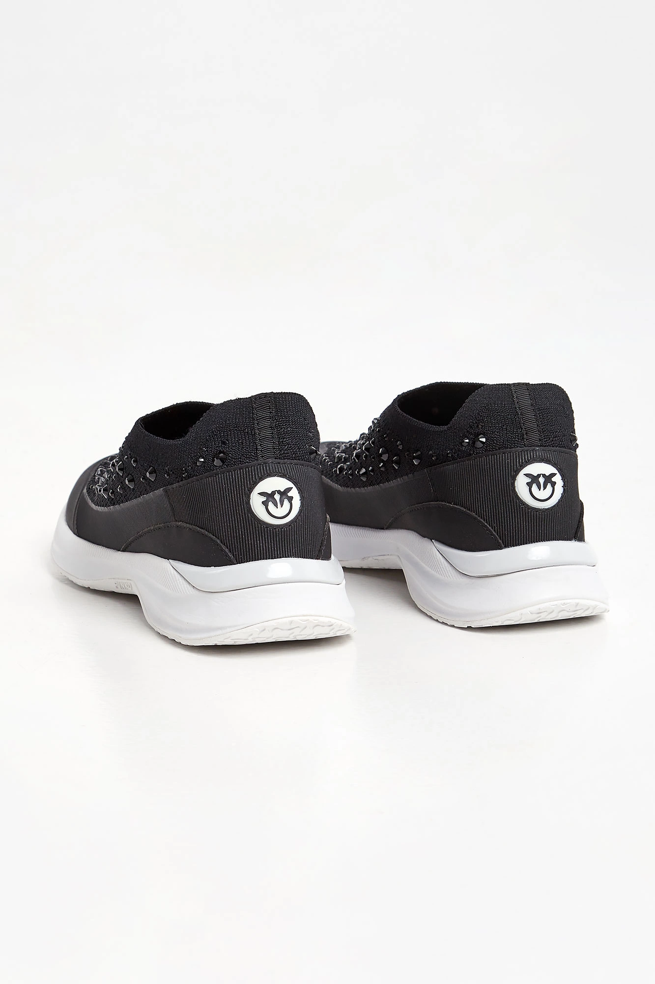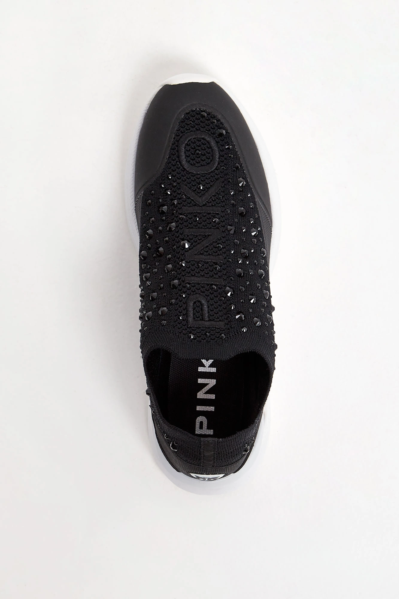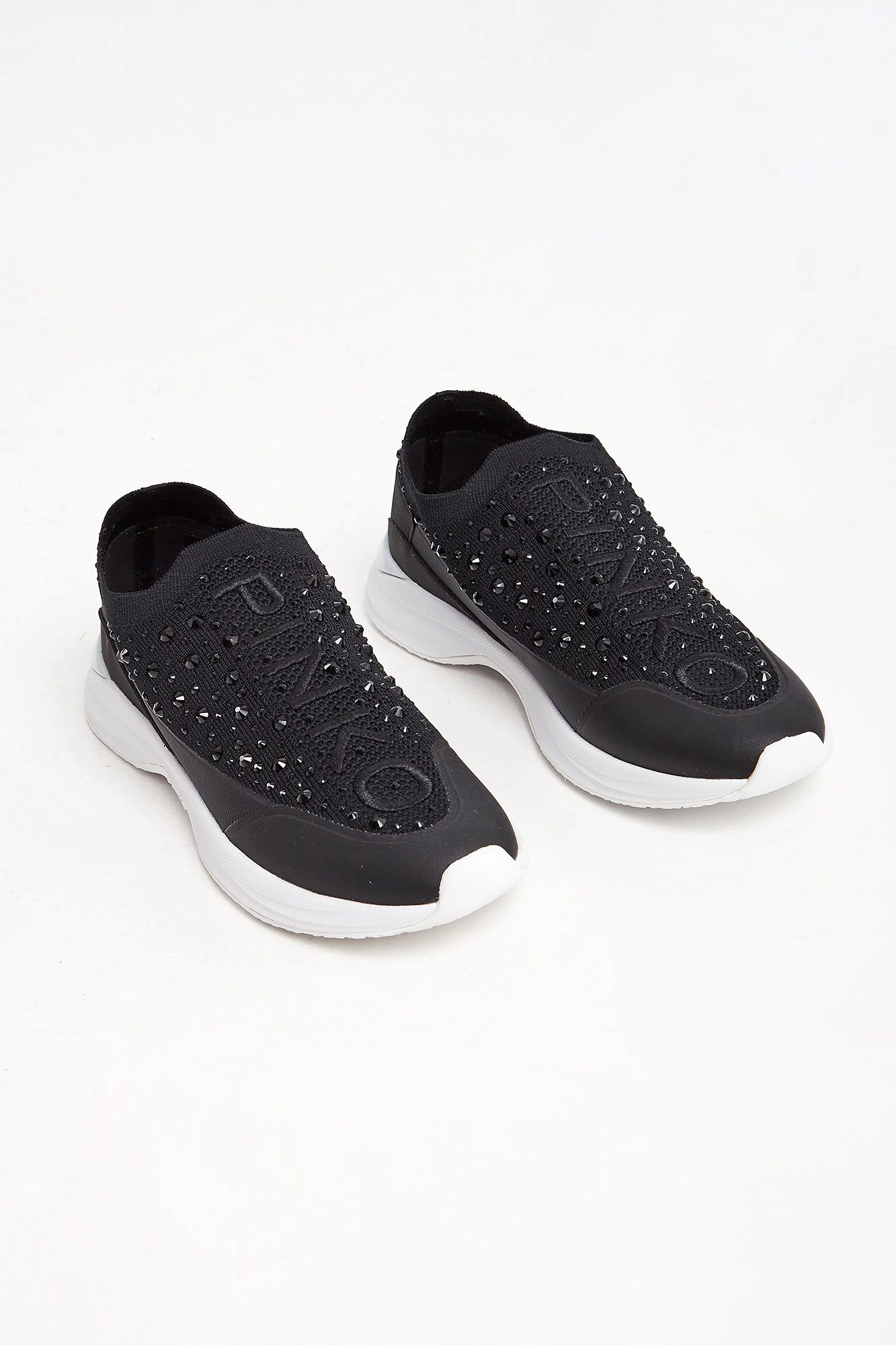 Sneakersy marki Pinko w czarnym kolorze. Wsuwane. Na całości wstawki ozdobnych cyrkonii. Z przodu haft z nazwą marki. Z tyłu gumowa aplikacja z logo marki. Wewnątrz sygnowana wyściółka. Tłoczona, sygnowana podeszwa w białym kolorze.