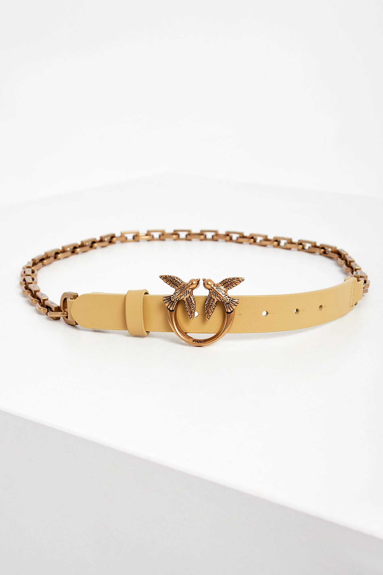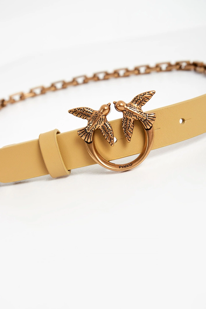 Wąski pasek Love Day marki Pinko w bananowym kolorze. Wykonany ze skóry naturalnej oraz złotego, sygnowanego łańcucha. Zapinany za pomocą złotej klamry z bolcem w kształcie charakterystycznego logo "Love Birds". Klasyka z nietuzinkowym wykończeniem.