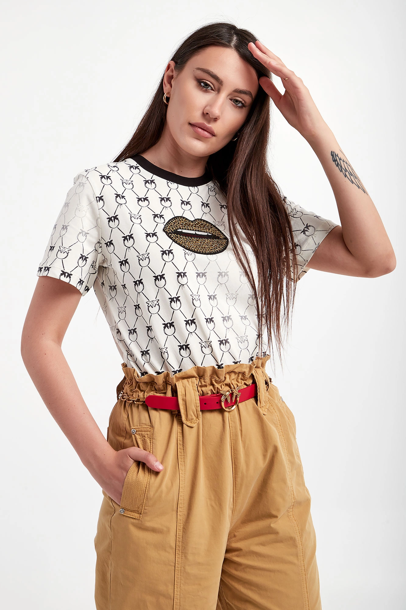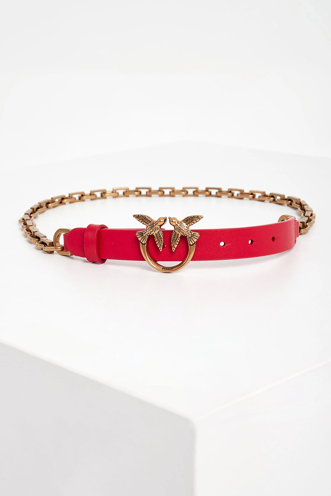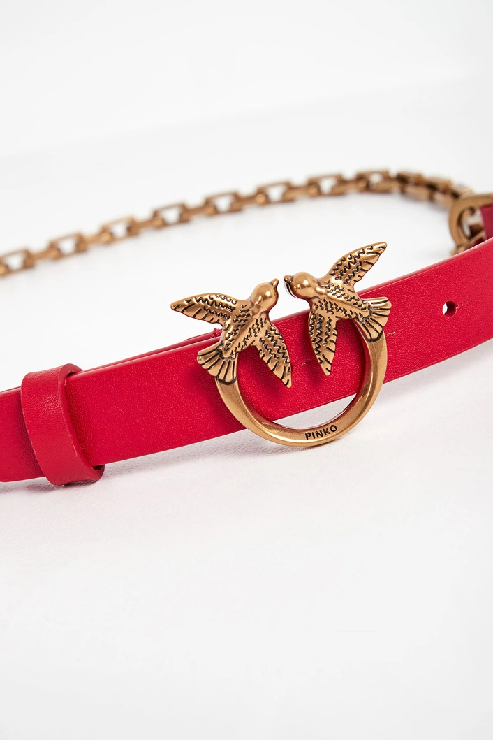 Wąski pasek Love Day marki Pinko w czerwonym kolorze. Wykonany ze skóry naturalnej oraz złotego, sygnowanego łańcucha. Zapinany za pomocą złotej klamry z bolcem w kształcie charakterystycznego logo "Love Birds". Klasyka z nietuzinkowym wykończeniem.
