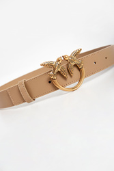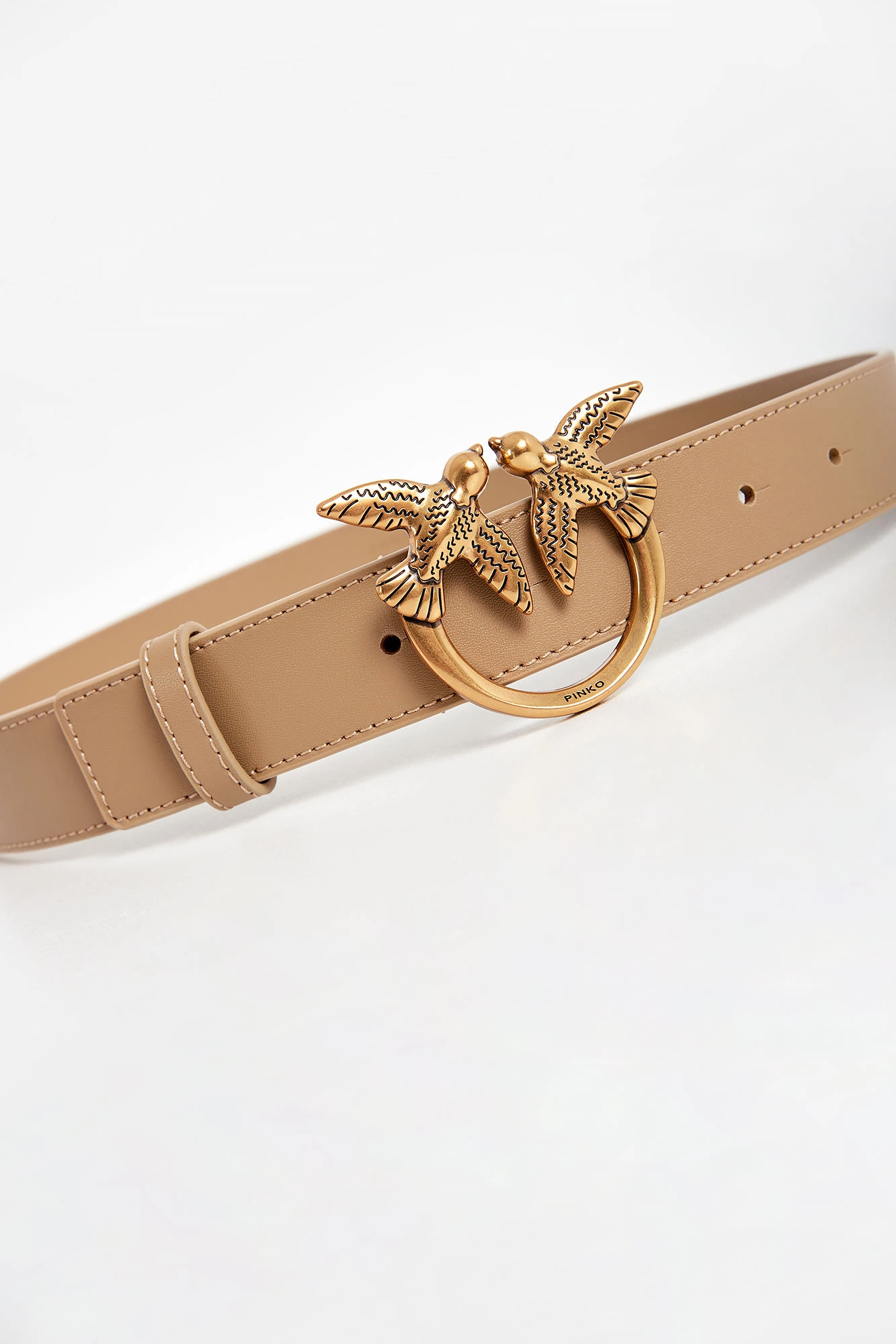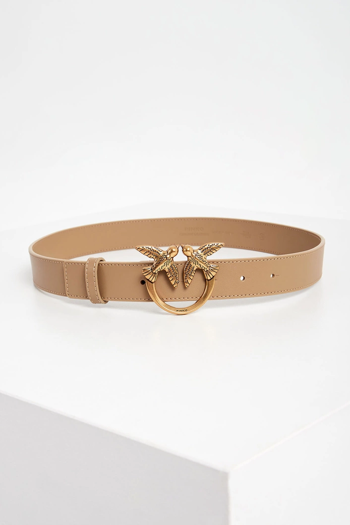 Pasek marki Pinko w beżowym kolorze. Wykonany ze skóry naturalnej. Zapinany za pomocą złotej klamry z bolcem, w kształcie charakterystycznego logo "Love Birds".