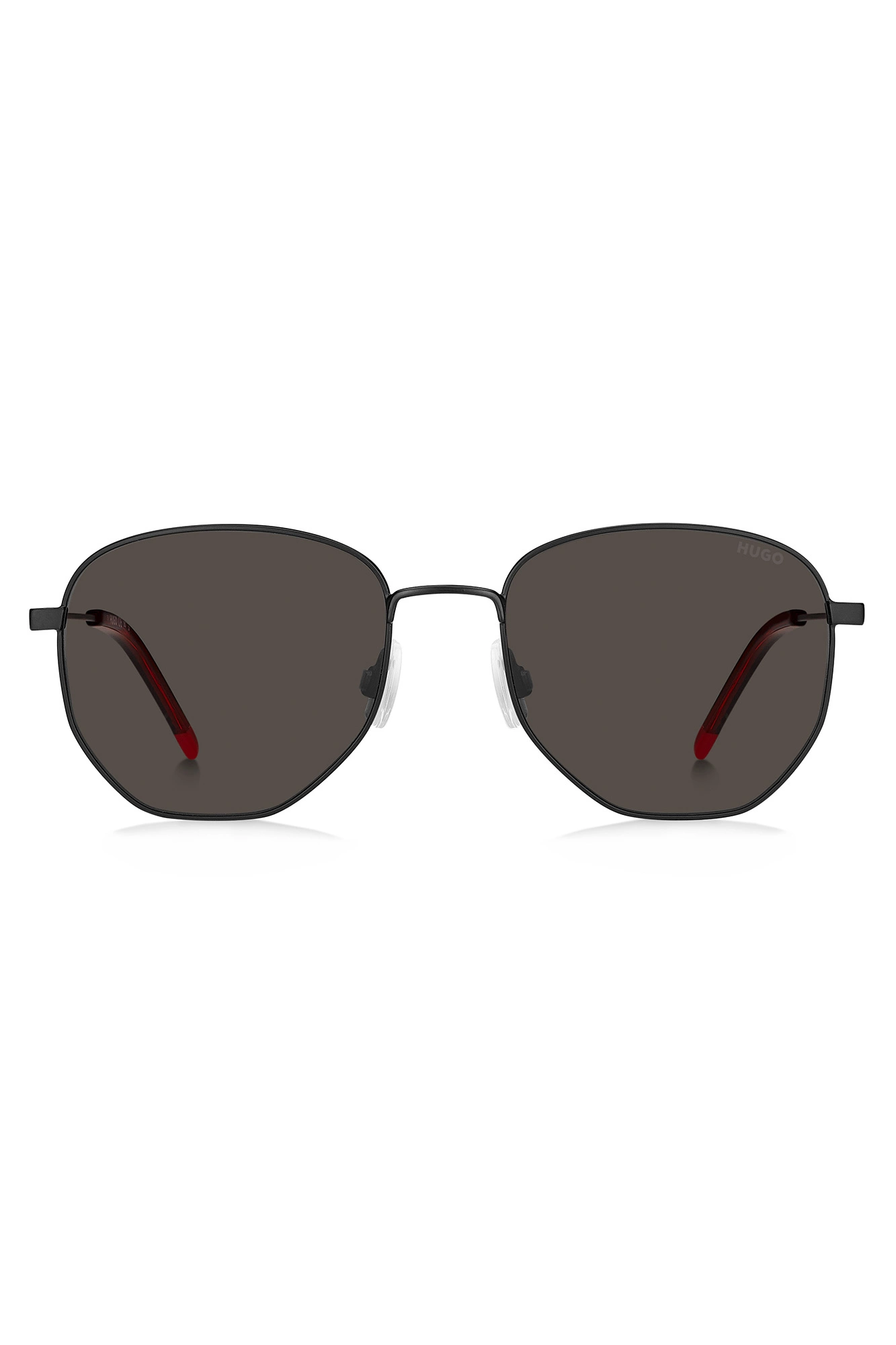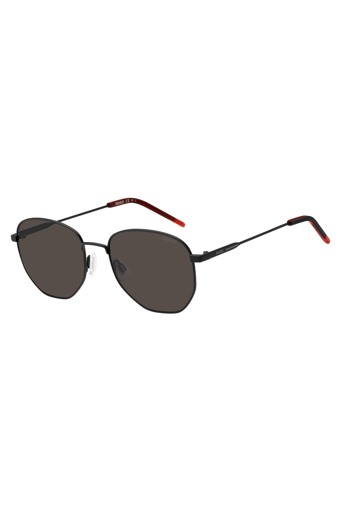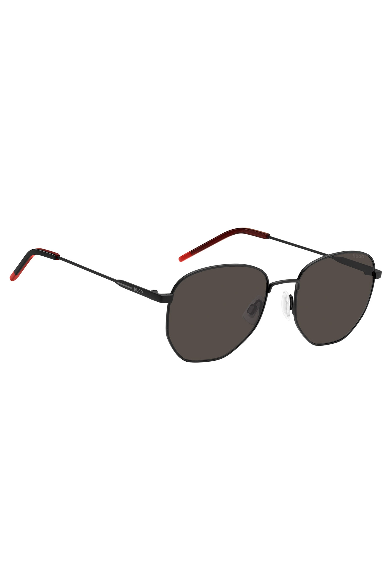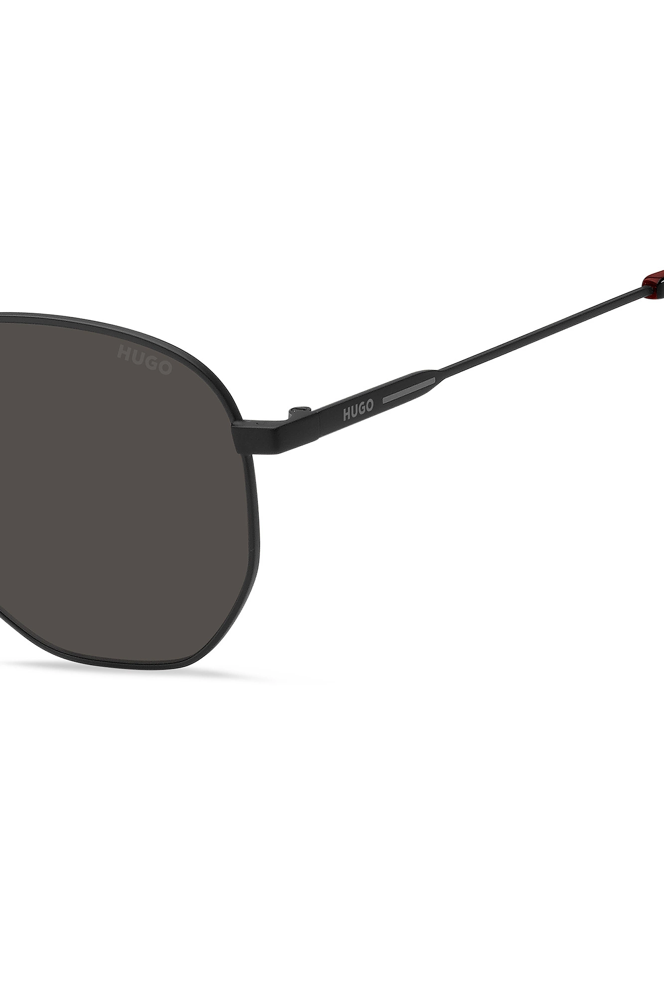 Okulary marki Hugo Boss w czarnym kolorze. Model typu Aviator. Wyprofilowane, sygnowane zauszniki z czarno-pomarańczowymi, kontrastującymi końcówkami. Ruchome, silikonowe noski. Sygnowane szkła w ciemnoszarym kolorze.