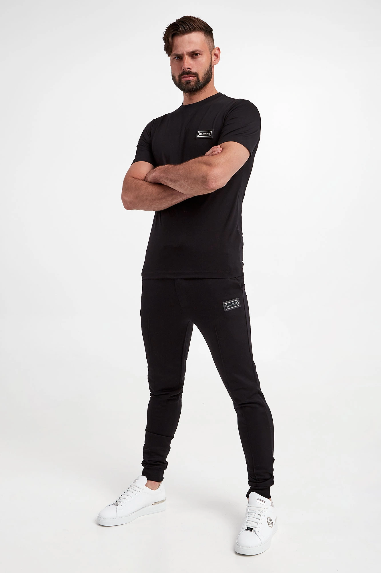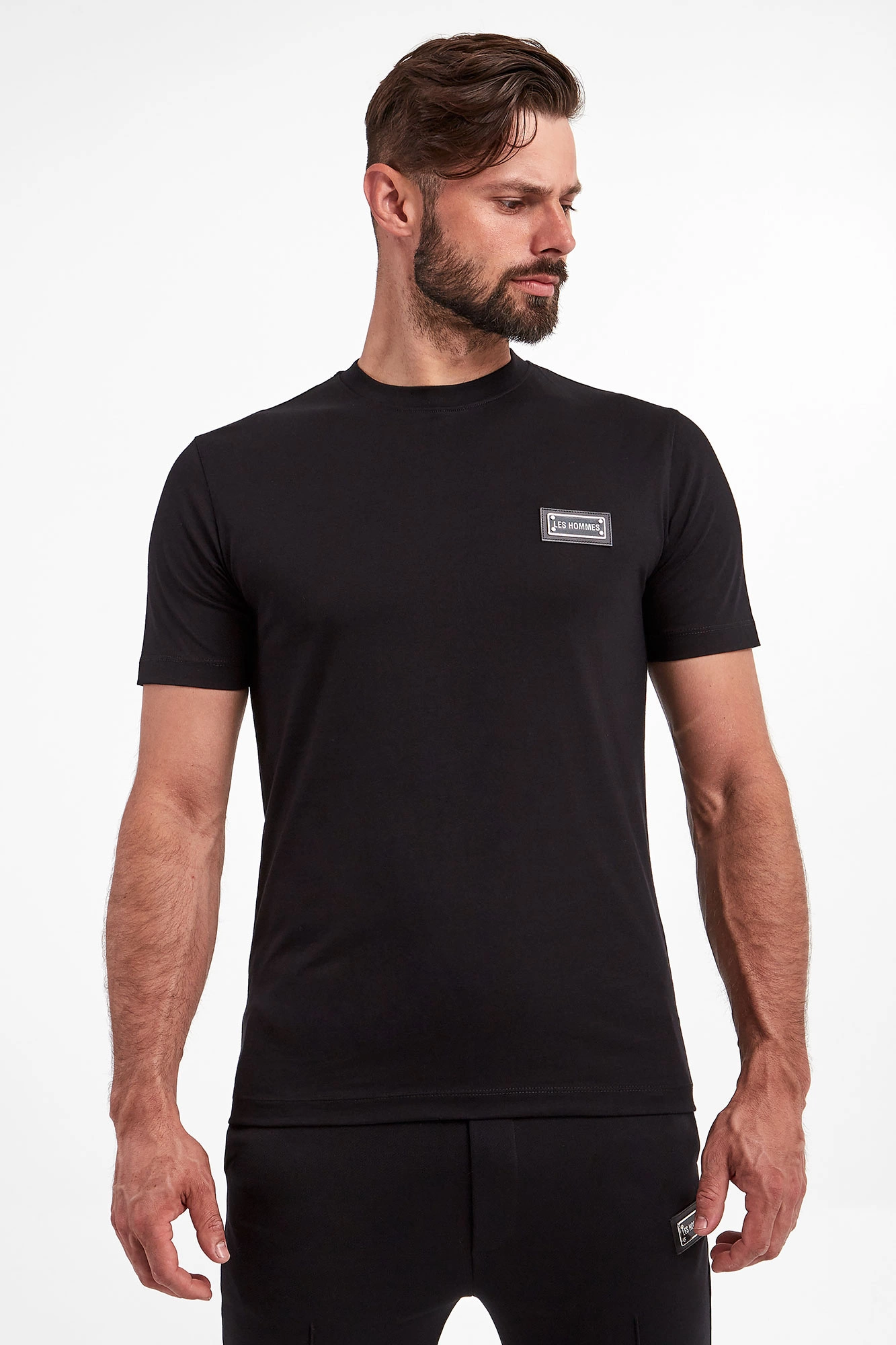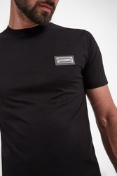 T-shirt marki Les Hommes w czarnym kolorze. Fason regular fit. Z boku metalowa zawieszka z nazwą marki ozdobiona skórzanymi wstawkami. Dekolt typu o-neck zakończony ściągaczem. Krótkie rękawy i dół wykończone lamówką. Wykonany ze stuprocentowej, bawełnianej, merceryzowanej tkaniny.